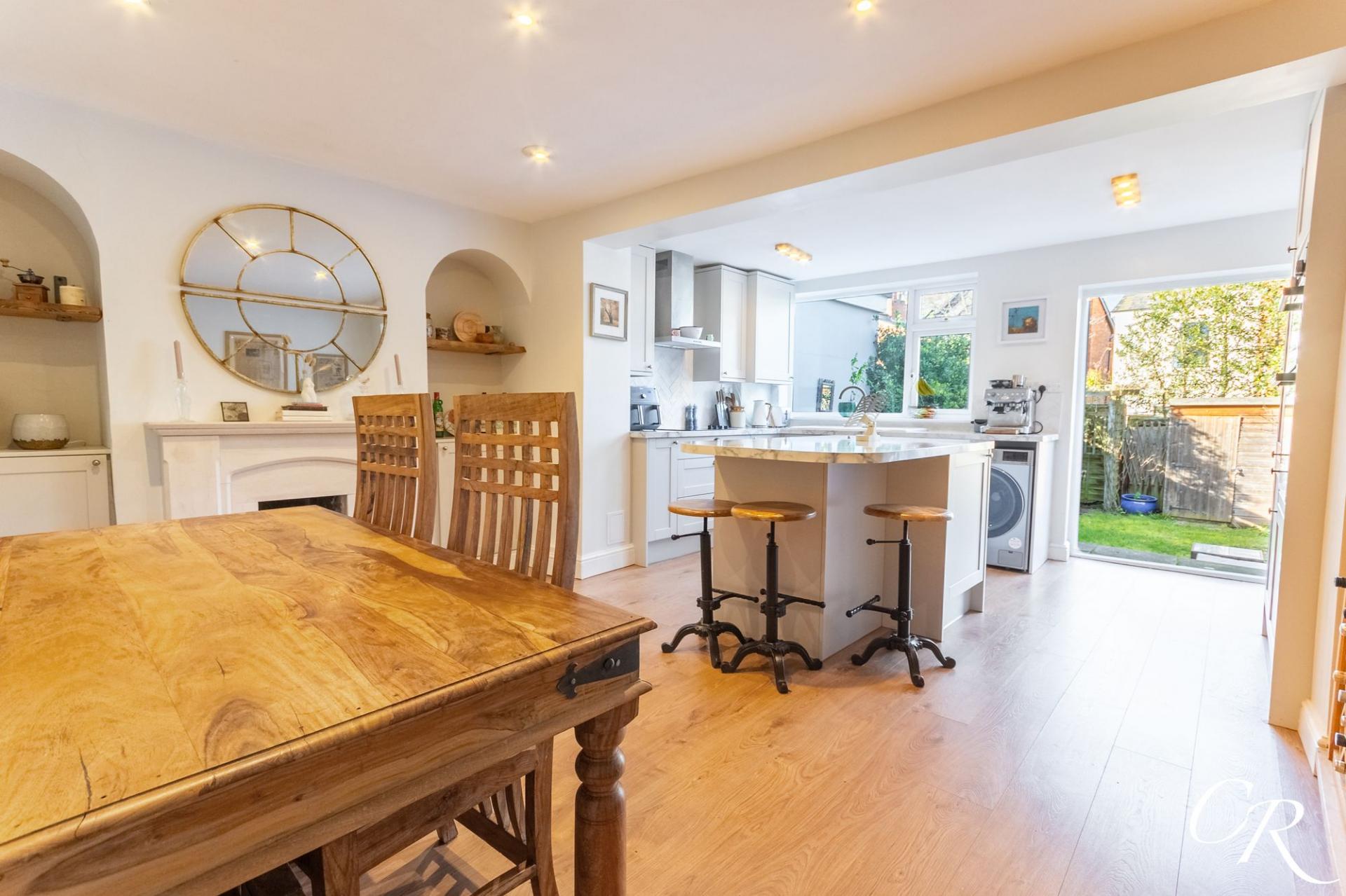 Dining Room: Opening seamlessly from the kitchen, the dining area offers ample space for a full-sized table and chairs, ideal for entertaining. Recessed alcoves and a feature fireplace add character, while the open-plan layout enhances the sense of space and flow.