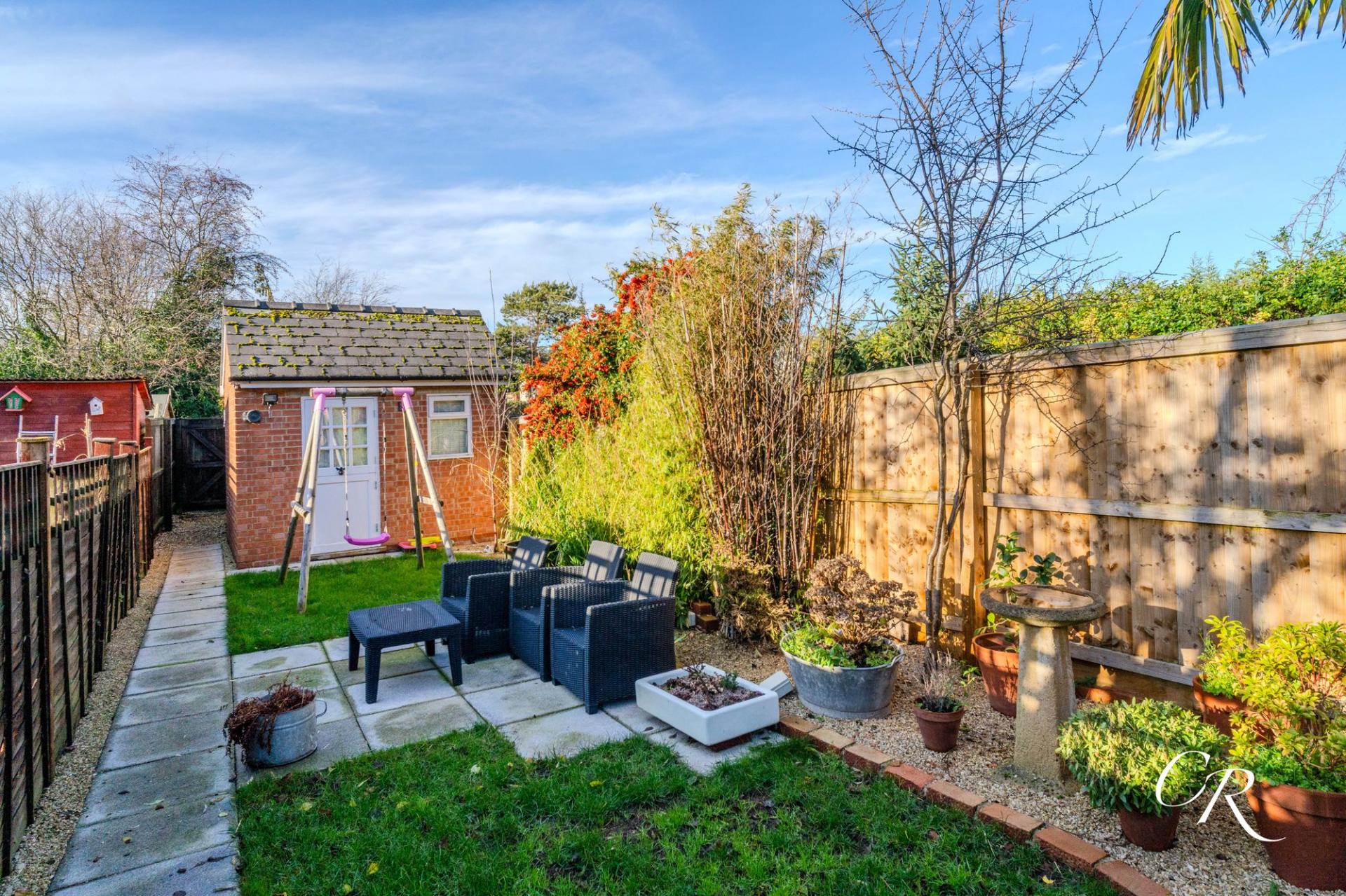 Rear Garden: A well-established and thoughtfully landscaped garden with a spacious patio for dining, central lawn, mature planting and a palm tree adding interest. A pathway leads to the garden room, with a garden shed positioned directly behind for excellent additional storage. A pedestrian gate provides access to the lane at the rear of the property ideal for bicycles, garden supplies or practical everyday use.