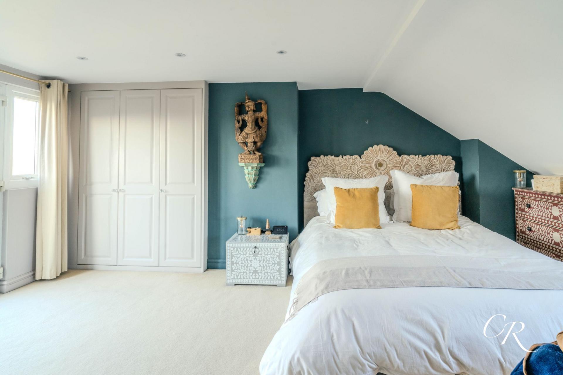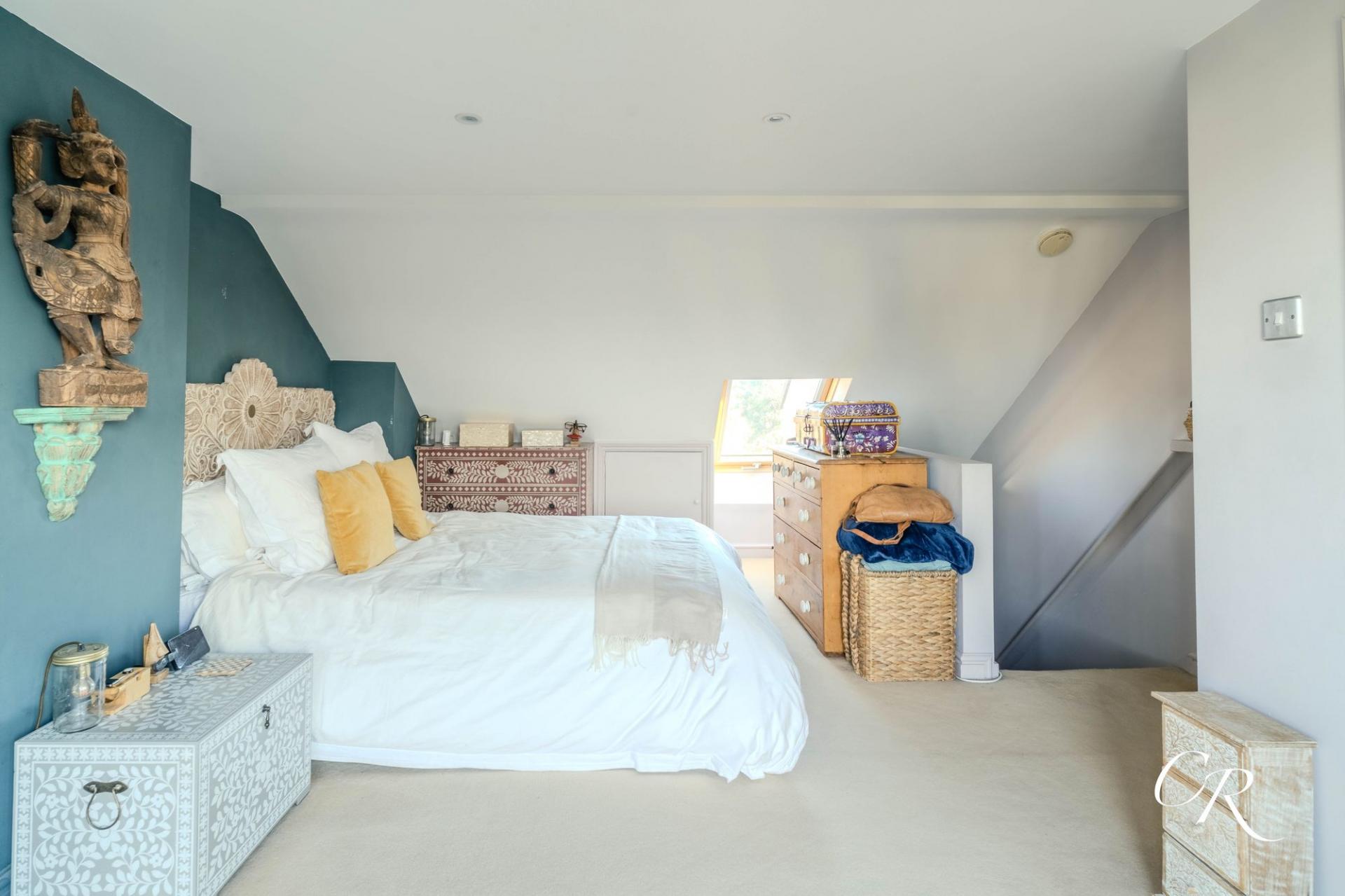 Bedroom One: An impressive principal bedroom spanning the top floor, with a Juliet balcony offering views across neighbouring rooftops and toward the hills beyond. Includes fitted wardrobes and a Velux window for additional light. Characterful sloping ceilings add charm, with some areas of limited head height.