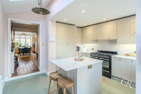 Kitchen / Breakfast Room: A superb extended kitchen forming the heart of the home. Fitted with shaker-style cabinetry, marble-effect worktops, brass hardware and a central island providing seating and preparation space. Features include a range-style cooker, herringbone splashback, Butler sink and a filtered boiling water tap. French doors and overhead glazing fill the space with natural light and open directly onto the garden for seamless indoor–outdoor living.