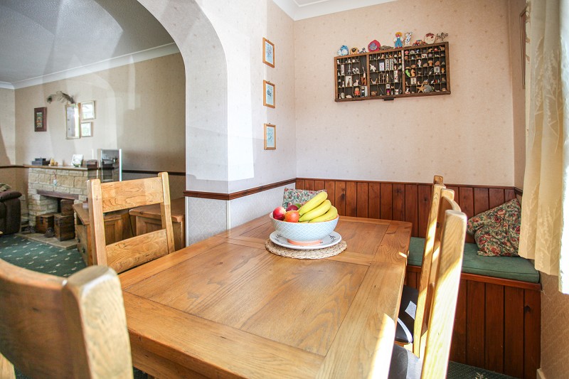 With stone effect fireplace for ornamental purposes with stone flagged hearth. Highlighted dado rail, cornice moulded ceiling, with back to back hatch to kitchen and glazed door and window leading to rear conservatory.