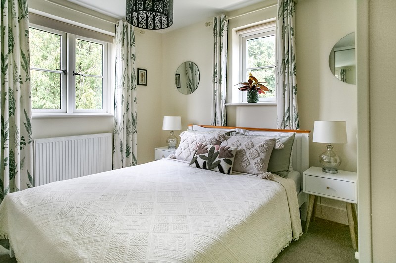 Dual-aspected room, westerly-facing bay window to front, northerly-facing side window, both with louvred shutters. Two double radiators. Particularly attractive aspect to the side overlooking treescape and gardens.
