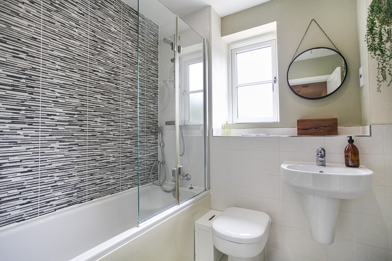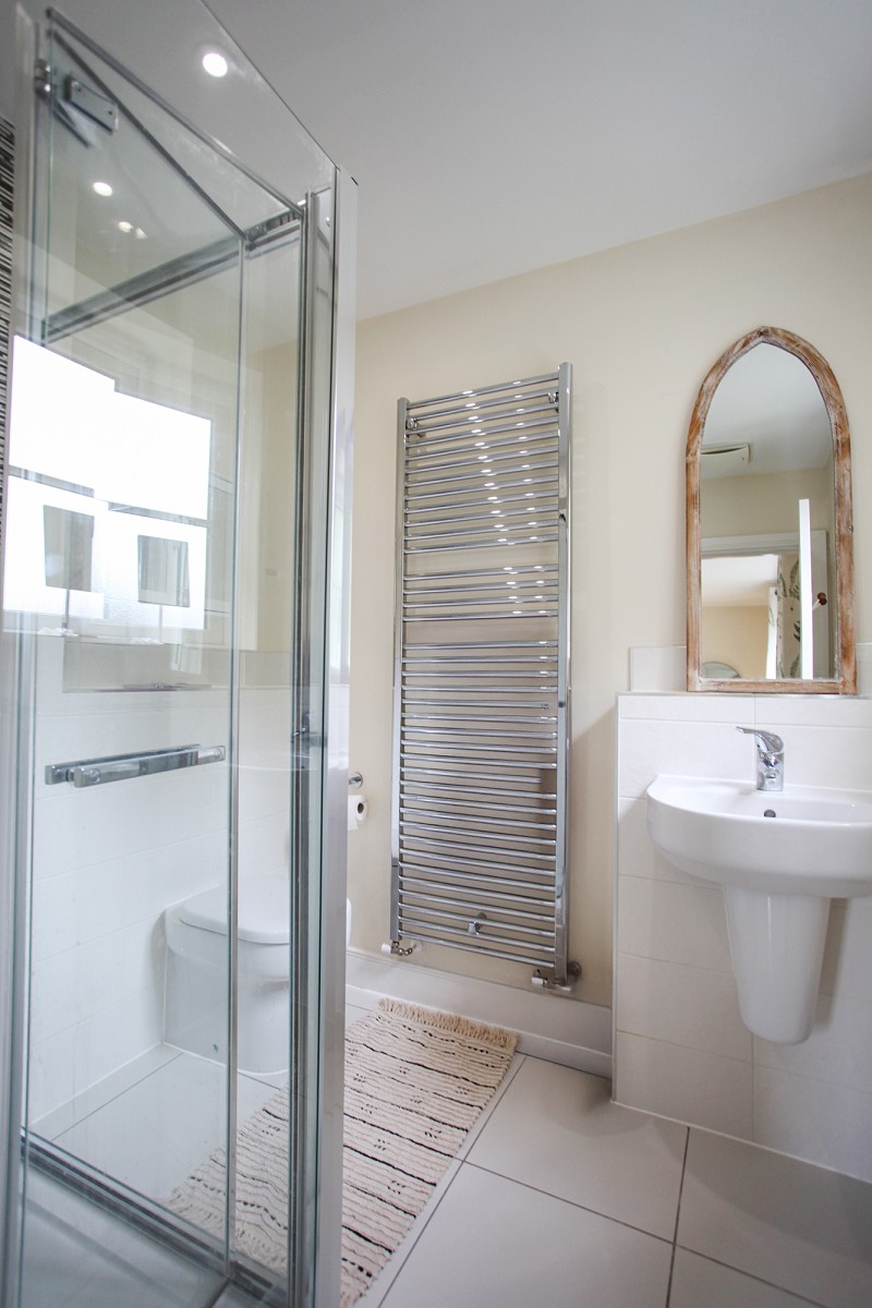 Three piece suite, wall-mounted wash hand basin, close coupled low flush w.c. Fully tiled shower cubicle with folding glazed screen and thermostatic shower. Ceramic tiled floor. Ladder-style chrome heated towel rail and radiator. Built-in extractor.
