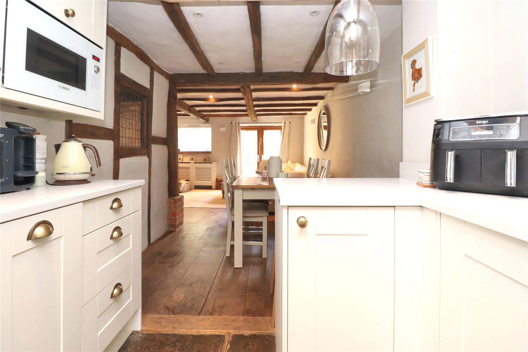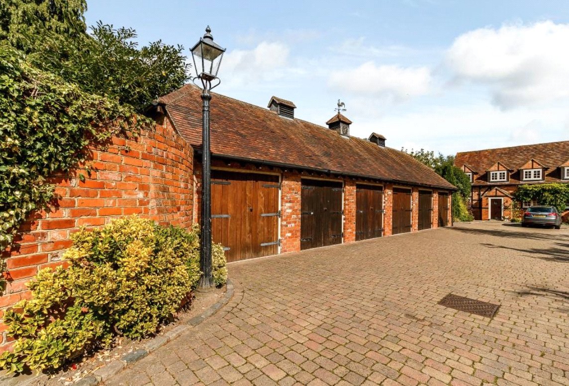 To the front, a flagstone-paved driveway, accessed via a five-bar timber gate, provides off-street parking for two cars. A side pathway leads to the rear garden, a tranquil space that feels remarkably peaceful given the central village location. The garden is framed by an attractive old-stock brick wall on one side, and at the rear by a matching garage with inset black timbersthe first in a block, accessed via the garden and through secure gates into a development of similar period-style homes. A full-width brick patio extends across the back of the house, leading onto a well-tended lawn.