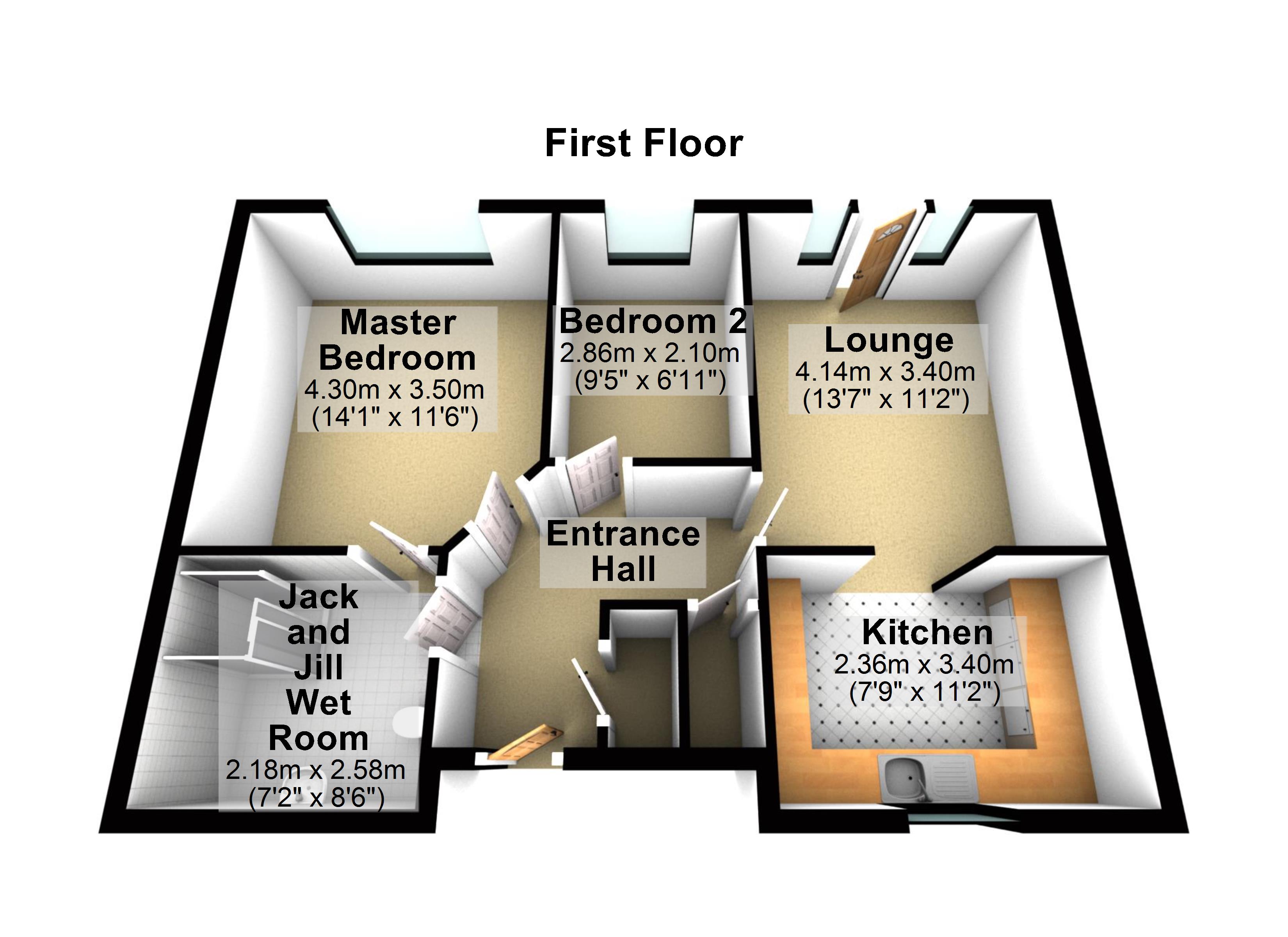 Master Bedroom 14'1" x 11'6" (4.3m x 3.5m).