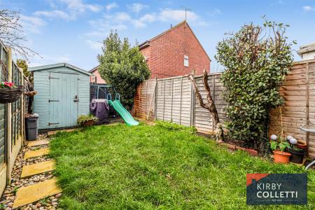 Rear Garden - 27ft deep. West facing. Laid to lawn with flower bed to side. Paved and pebbled path leading to rear patio area with Timber shed.