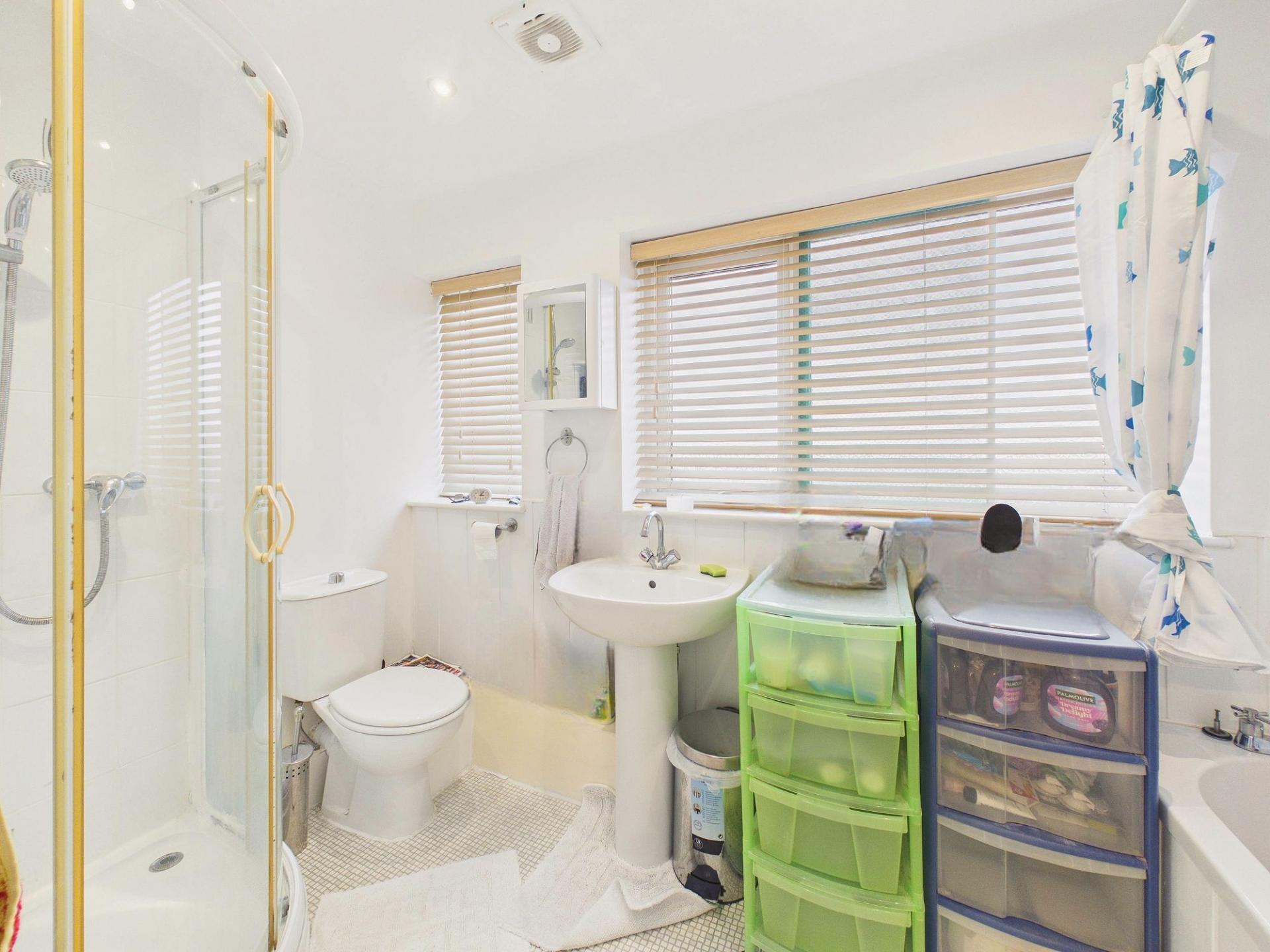 Upstairs, the property comprises three well-proportioned bedrooms. Two of these are generous double rooms, both benefiting from fitted wardrobes, providing excellent storage solutions. The family bathroom is spacious and features a four-piece suite with a bath, corner shower enclosure, WC, and hand wash basin.