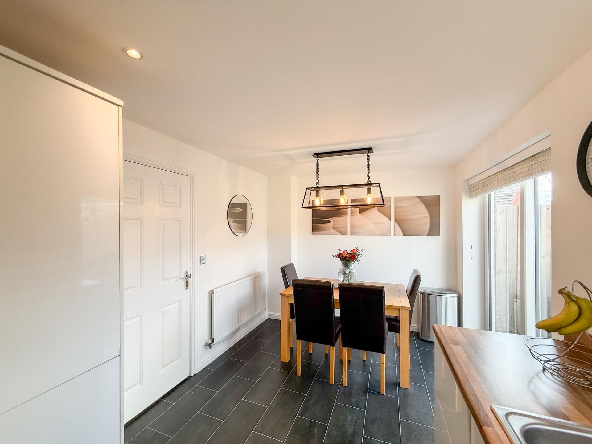 To the first floor, the property features three well-proportioned bedrooms, each offering versatility for use as sleeping accommodation, a home office, or hobby space. The main bedroom further benefits from access to a stylish en-suite shower room, adding a touch of luxury. A family bathroom is also located on this level, fitted with a modern white suite.