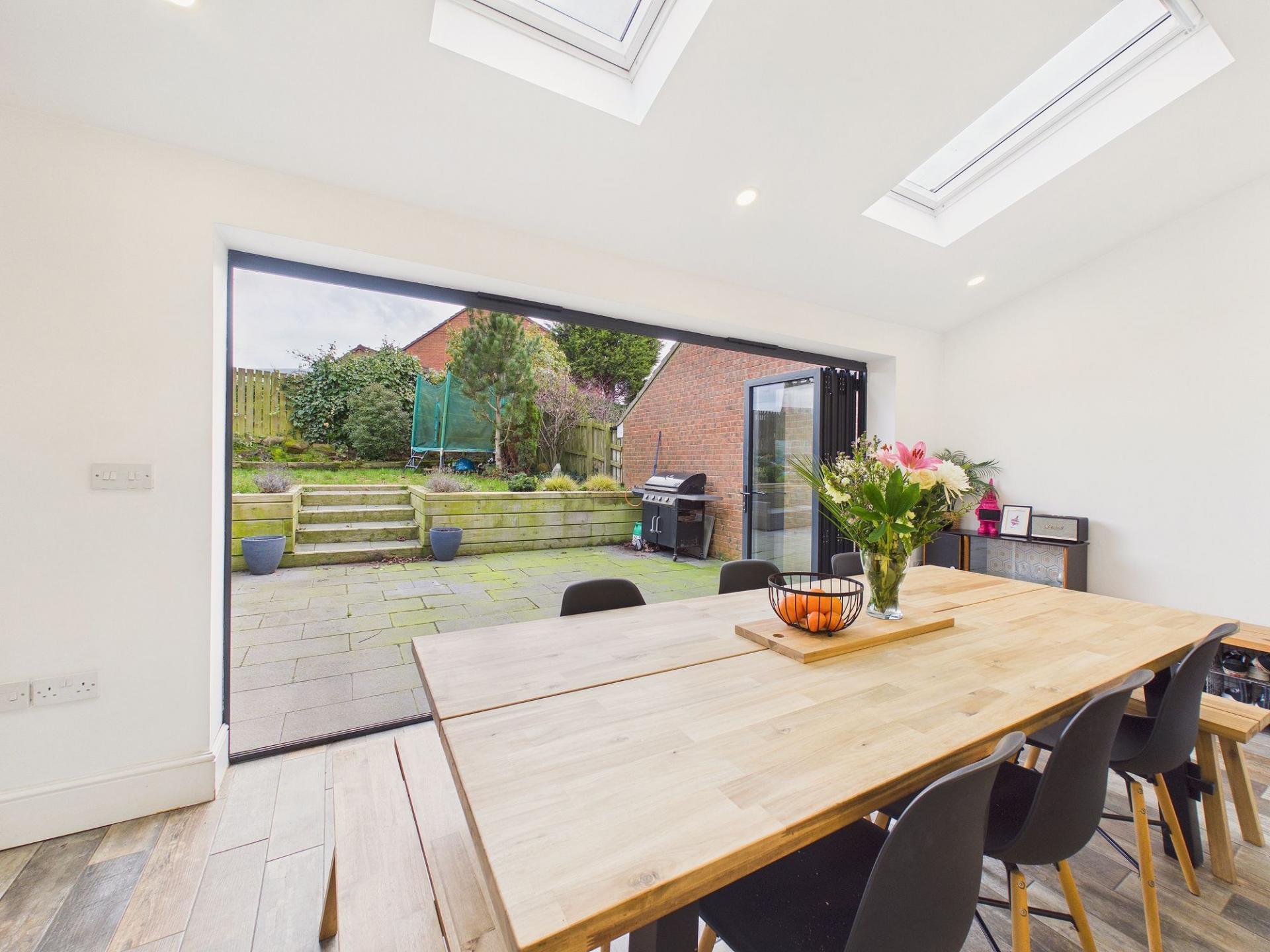 The heart of the home is undoubtedly the impressive extended dining kitchen and family area. Designed for modern family living and entertaining, the kitchen boasts a stylish range of contemporary units, built in cooking appliances and a central preparation island, offering both functionality and visual appeal. The adjoining dining and family space features two Velux-style windows and has stunning bi-folding doors that open directly onto the rear garden, seamlessly blending indoor and outdoor living.