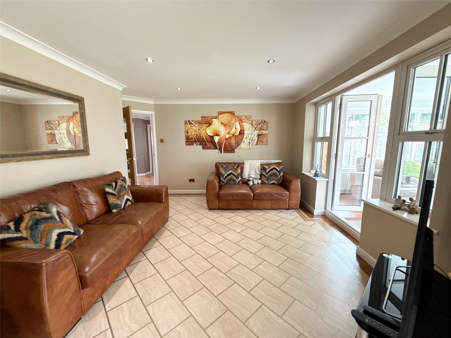A formal dining room offers an elegant setting for dinner parties and special occasions, while the heart of the home is undoubtedly the show-stopping open-plan kitchen and family living space. Featuring sleek units, a central island with a breakfasting bar, an under-counter wine cooler, and there is a full complement of built-in appliances. The kitchen flows seamlessly into the spacious family/dining area, where patio doors open into a stunning sunroomperfect for year-round enjoyment. From here, further patio doors lead to the spectacular rear garden, effortlessly connecting the indoors with the outdoors.