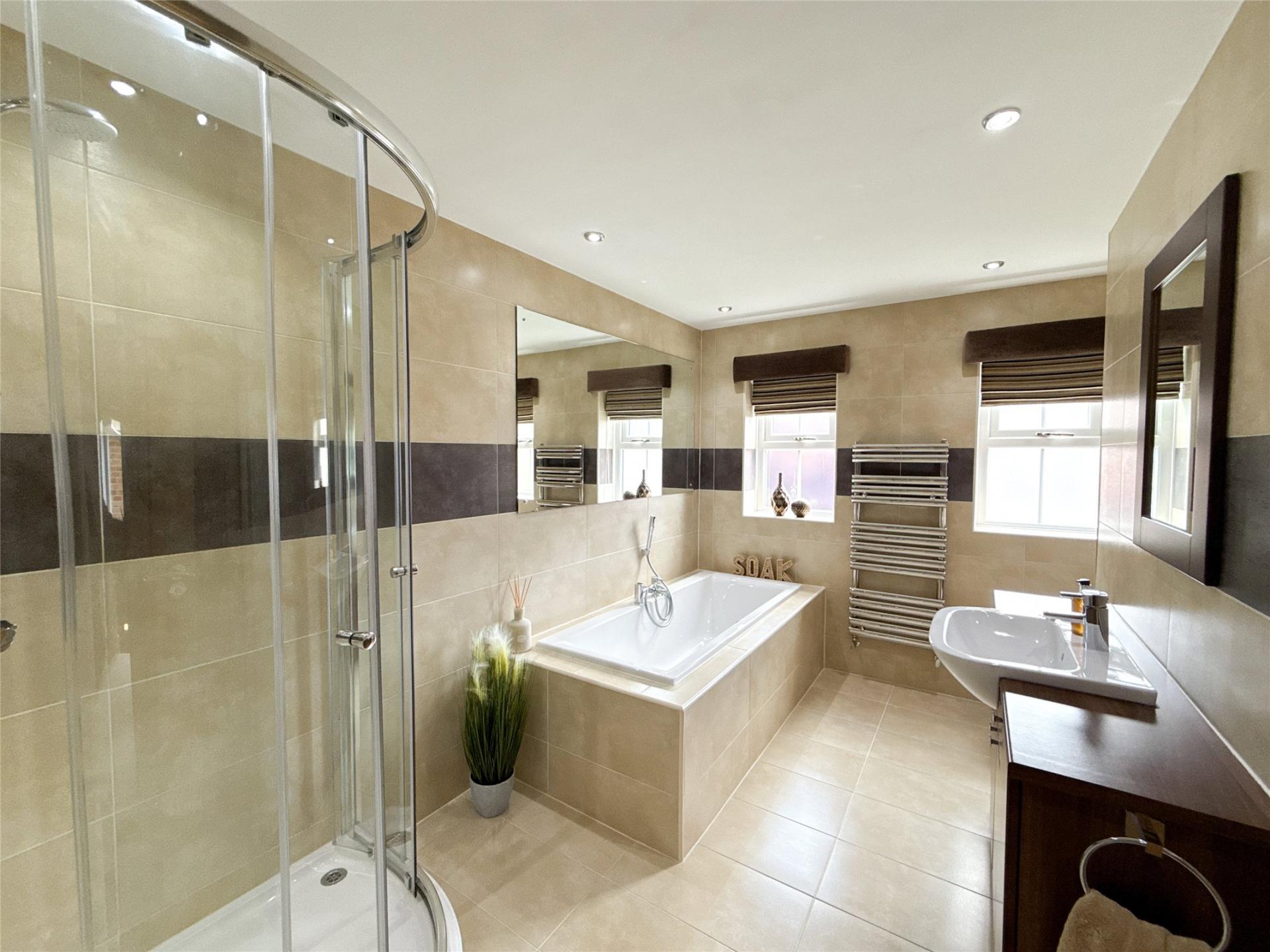 Upstairs, the home continues to impress. The luxurious principal bedroom suite is a sanctuary of calm, boasting bespoke fitted wardrobes and a sumptuous en-suite bathroom complete with a bath, separate shower enclosure, vanity unit with wash basin, and WC. The second double bedroom also benefits from stylish fitted wardrobes and an en-suite, offering comfort and privacy for guests or older children. Two additional well-appointed double bedrooms, both with fitted storage, are served by a beautiful family bathroom featuring a bath and a separate corner shower enclosure.