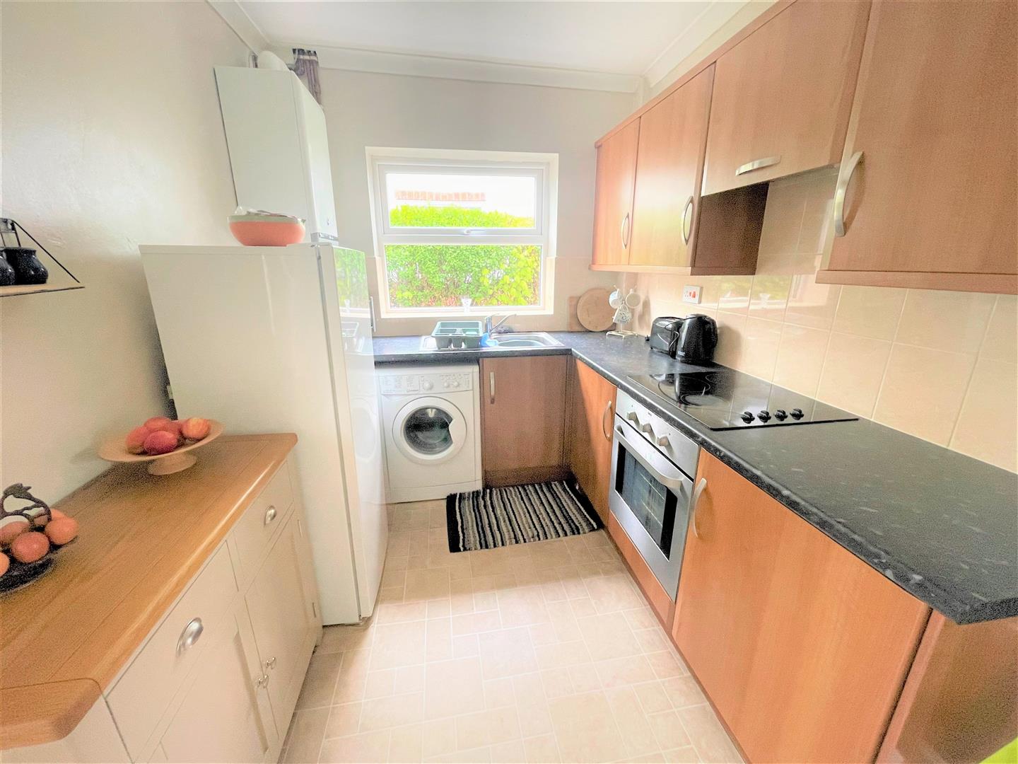 Kitchen - 3.35m x 2.24m (11'00 x 7'04 ) - Fitted kitchen featuring a range of wall and base units incorporating complementary work surfaces, inset stainless steel sink, ceramic hob with extractor above, electric oven, space for appliances, vinyl flooring, gas central heating radiator and double glazed window.