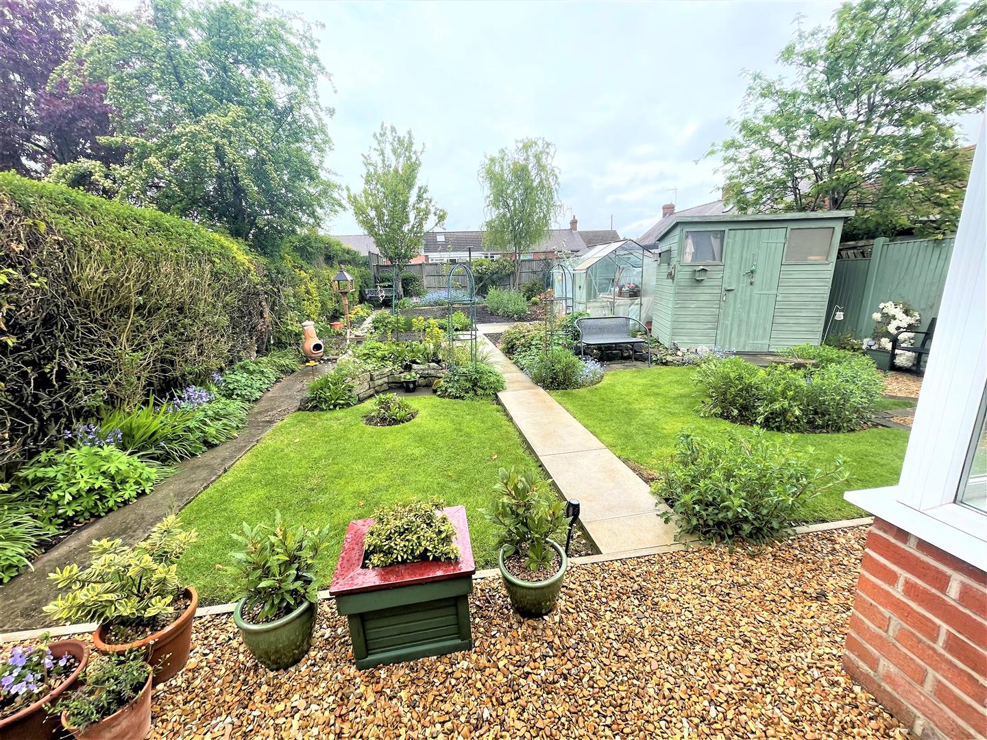 Rear Garden - A beautifully presented landscaped garden enjoying a good sized mainly laid to lawn incorporating decorative herbaceous borders, green house and garden shed.