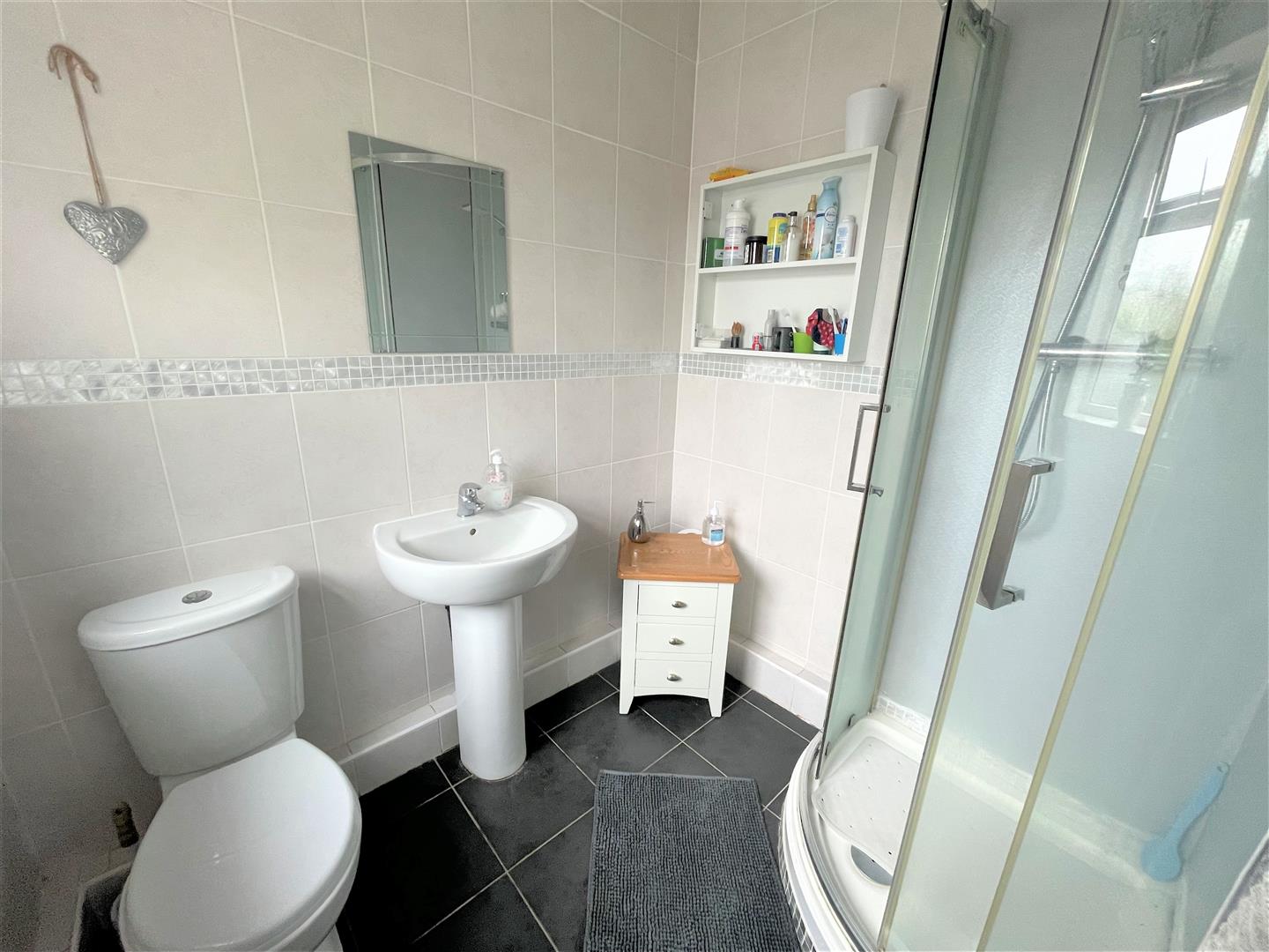 Shower Room - 1.98m x 1.70m (6'06 x 5'07) - Shower room comprises: Shower enclosure, pedestal wash hand basin, WC, complementary tiling, heated towel rail and double glazed window.
