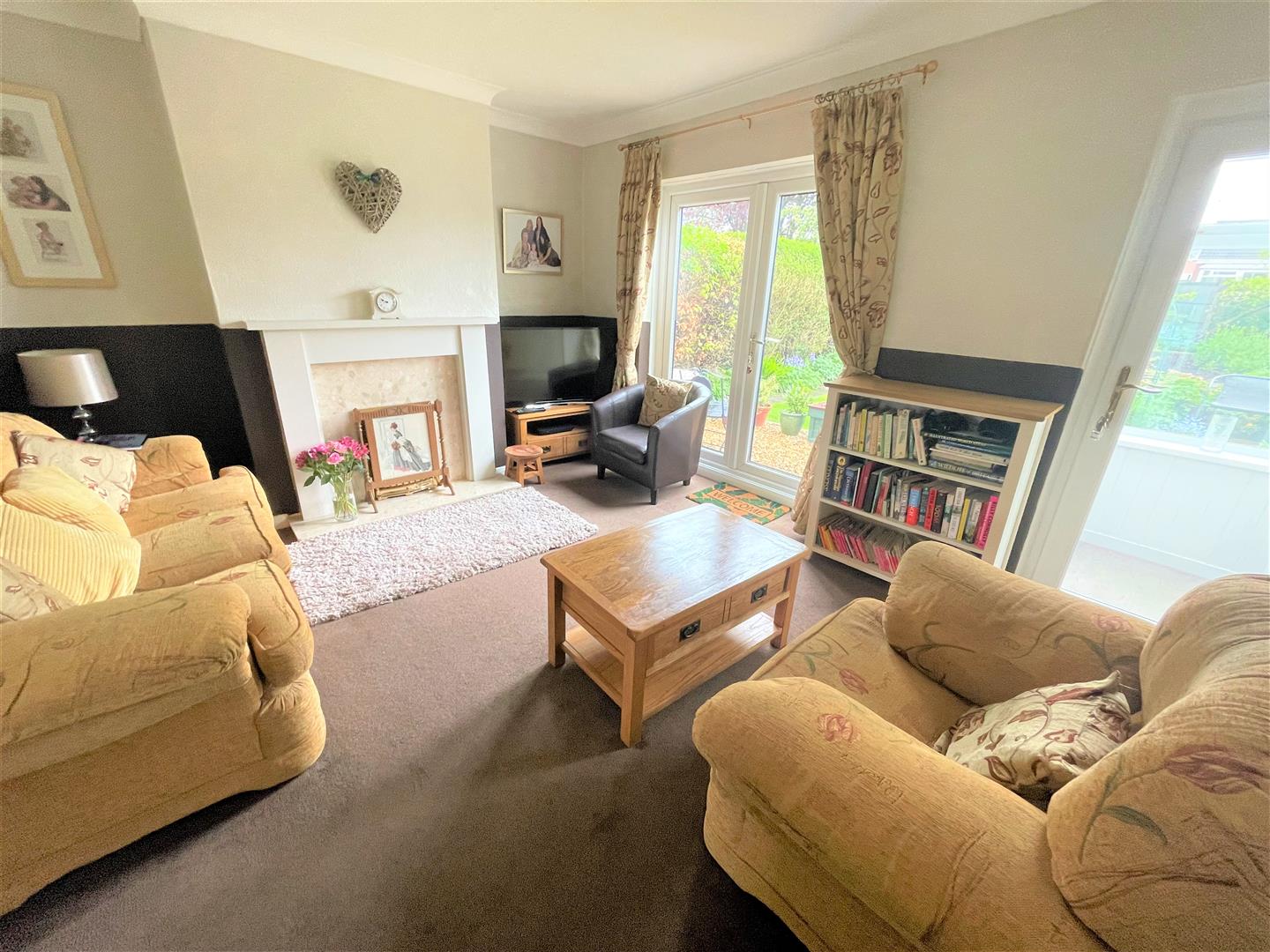 Lounge - 4.34m x 3.63m (14'03 x 11'11) - With door to rear porch, gas central heating radiator and French doors to rear garden. The focal point in the lounge has to be the feature fire place incorporating a marbled effect back and hearth housing the electric fire.