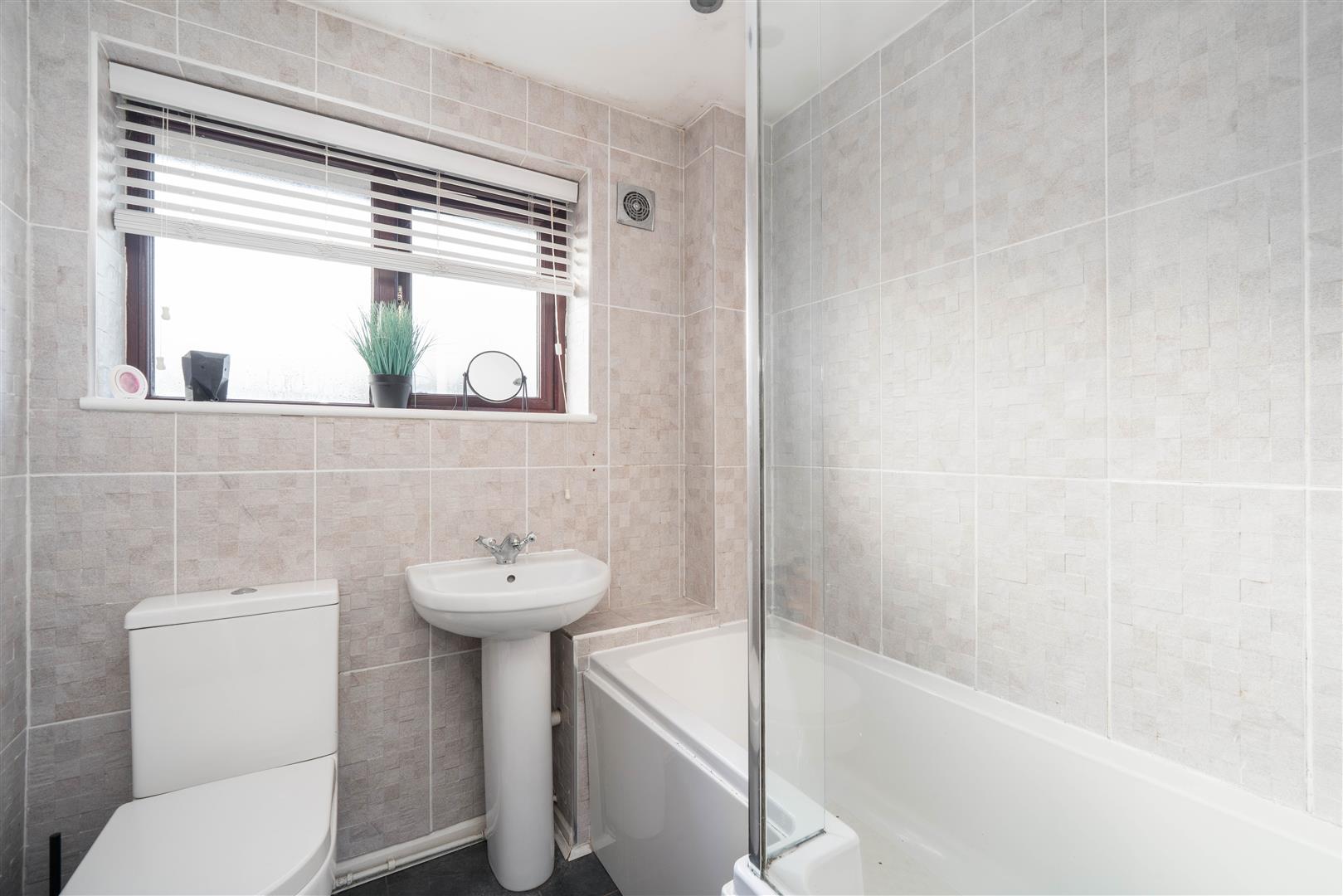 - Fully tiled bathroom with bath and overhead shower