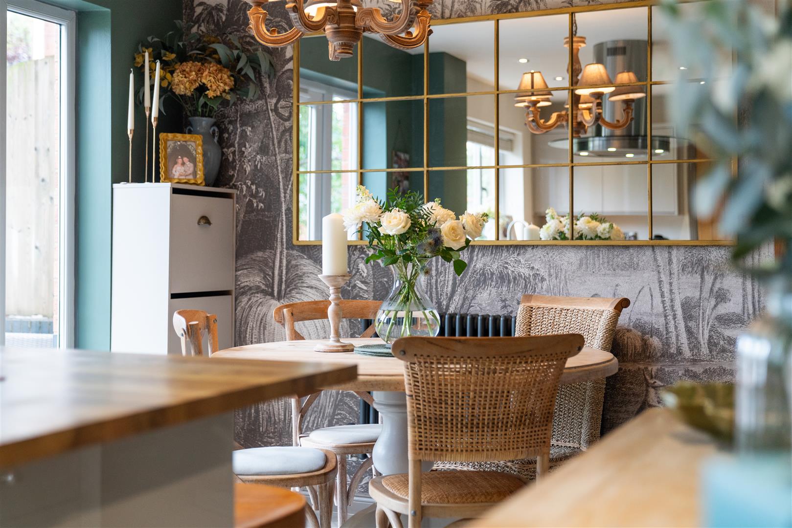 - Open plan dining room leading off the kitchen with patio doors into the garden