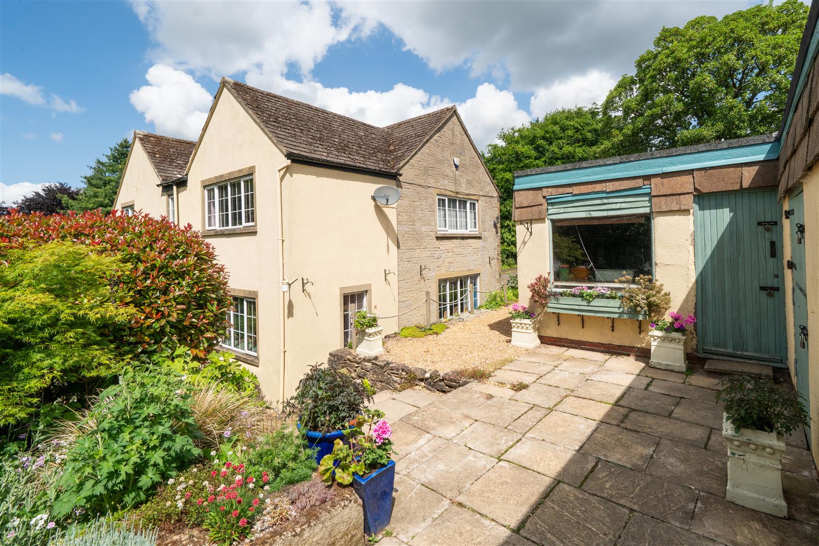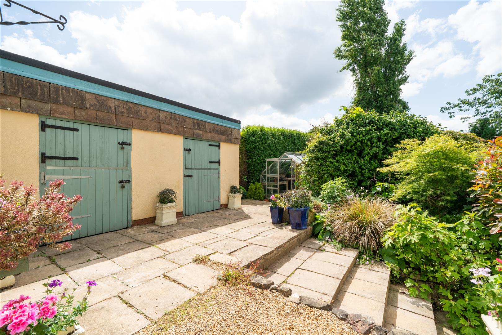 - Driveway, detached double garage and 2 stables