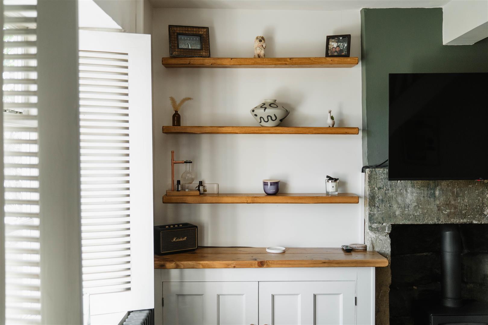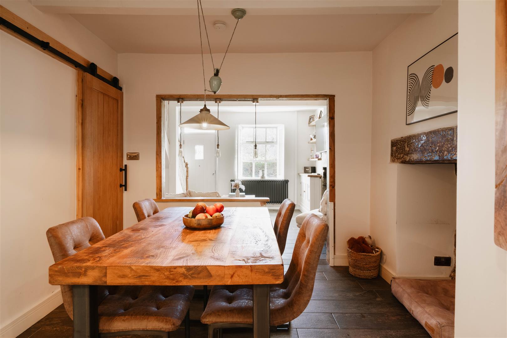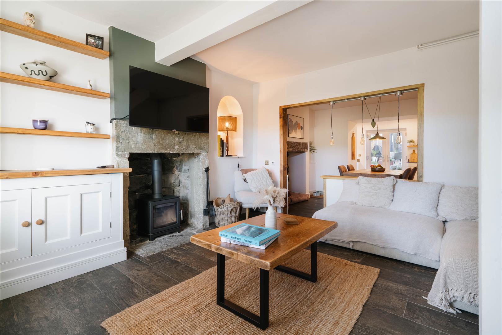 - Lounge with exposed stone fireplace and log burner and open plan dining room