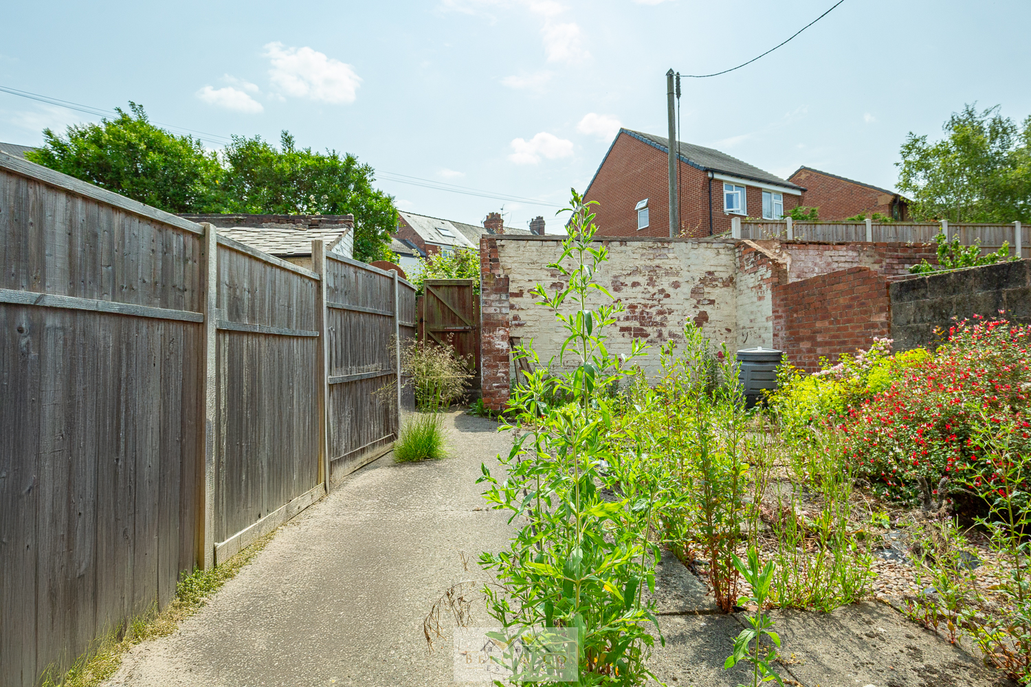 Front yard area with pathway to the entrance, private rear patio garden, including outbuilding for storage, rear gate access to the back lane – ideal for bins or additional entry point.