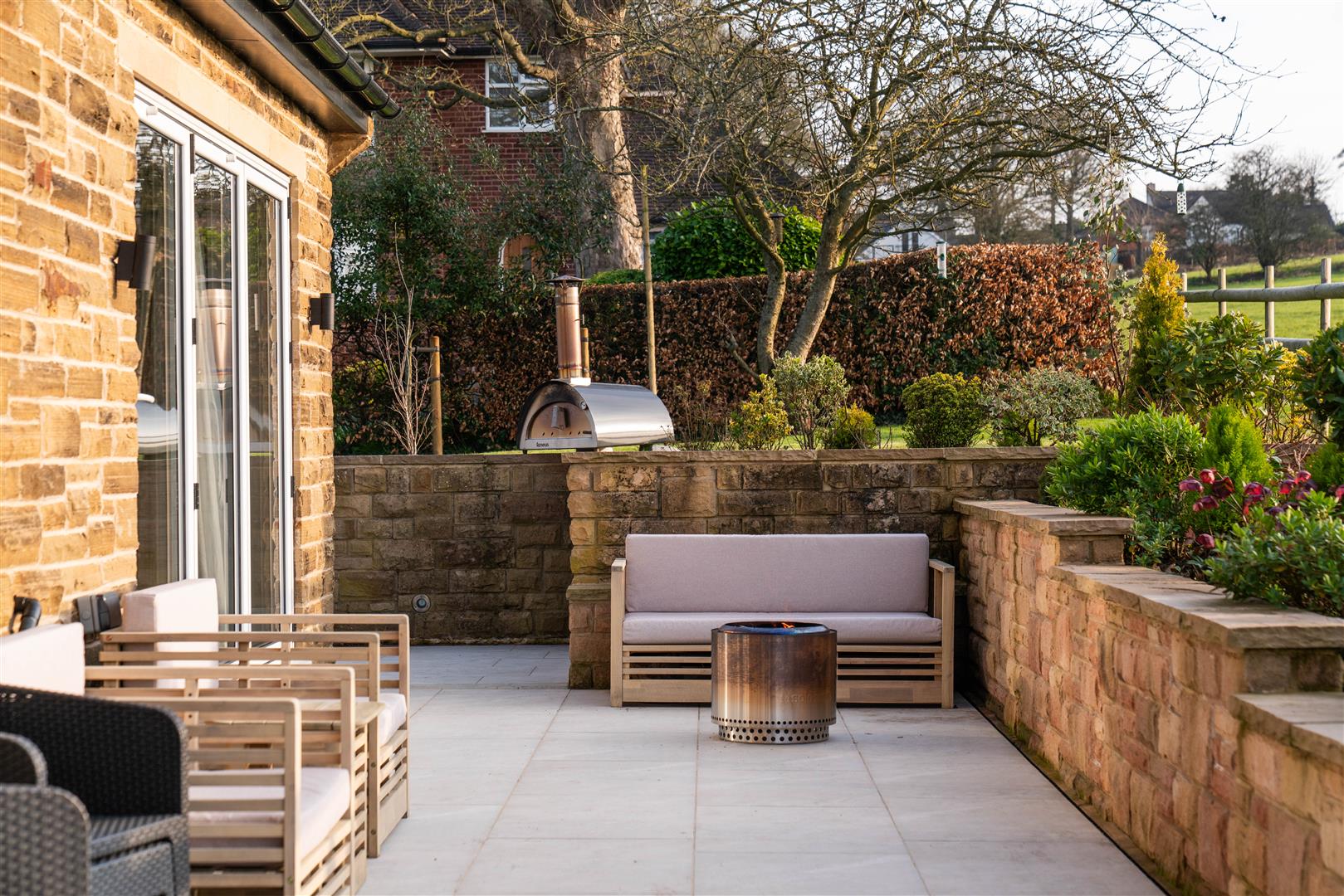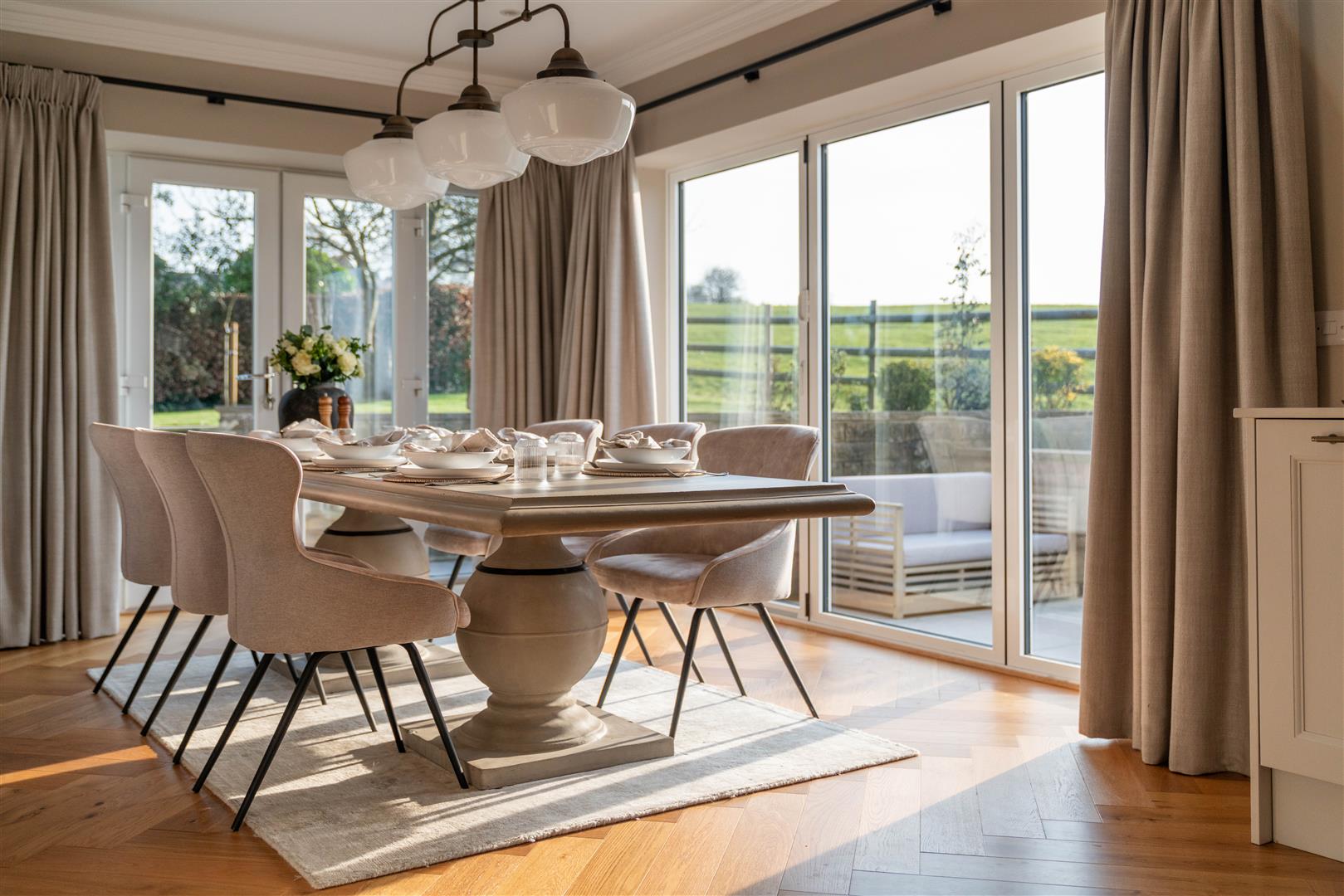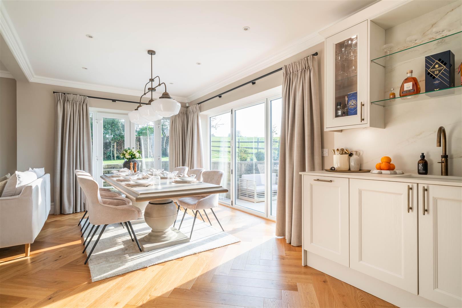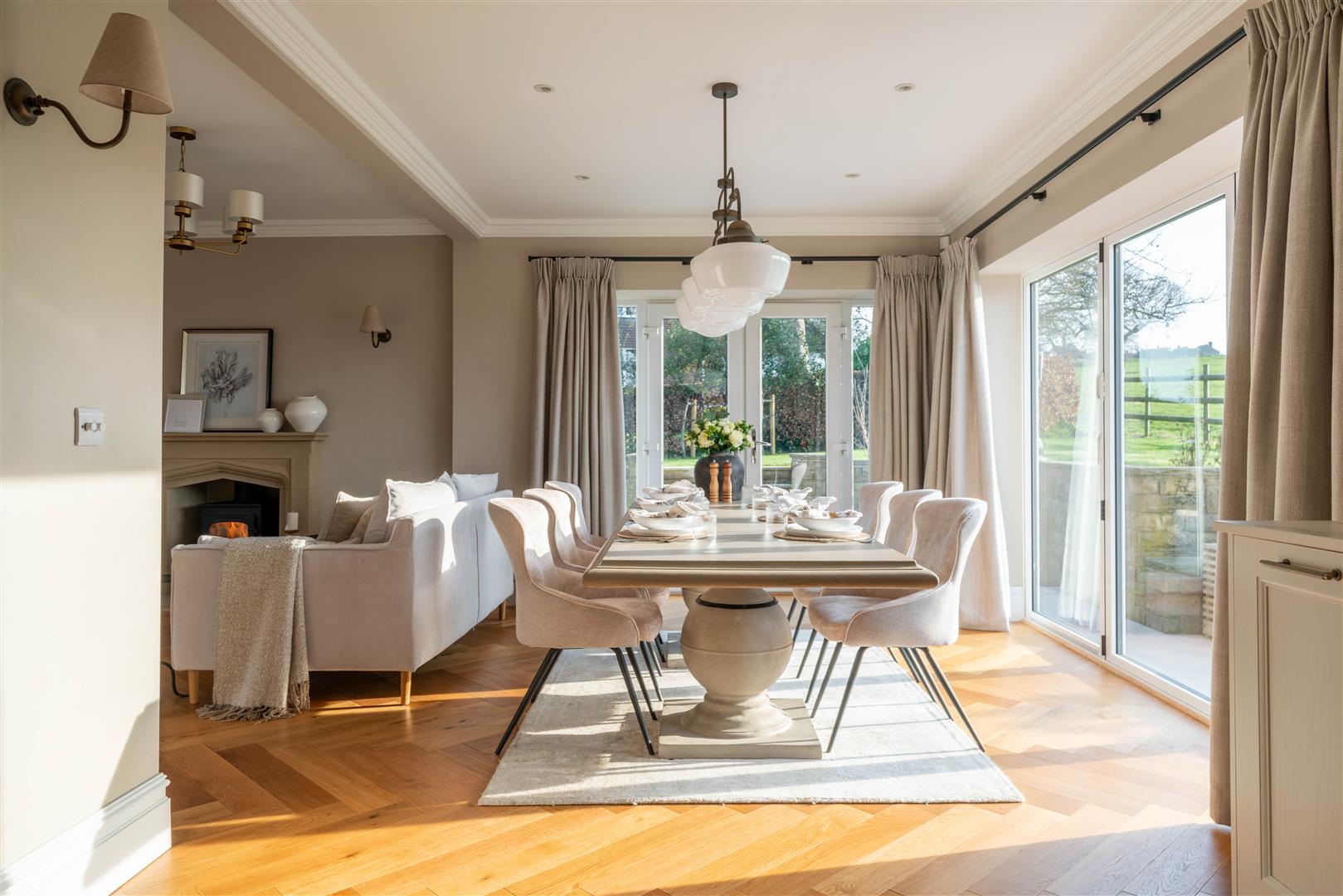 - Open plan living and dining space leading off the kitchen with dual aspect patio doors filling the home with natural light,