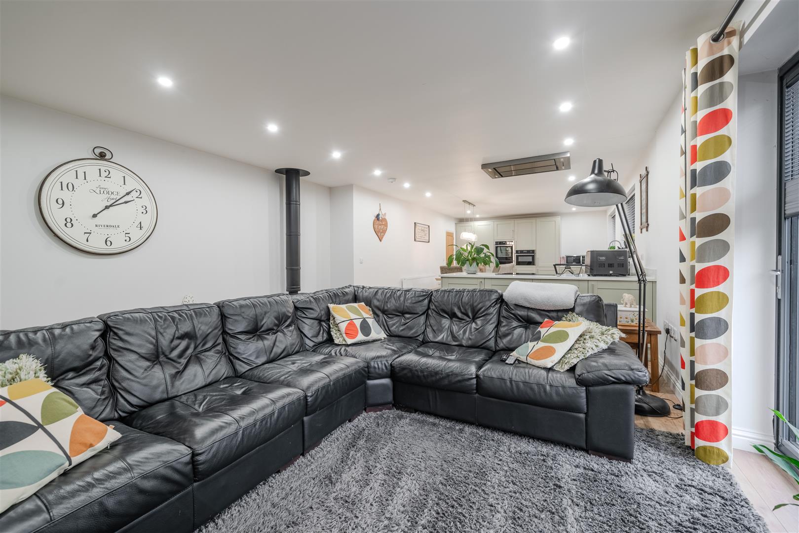 - Impressive family lounge with log burning stove and large bi-fold doors filling the room with natural light