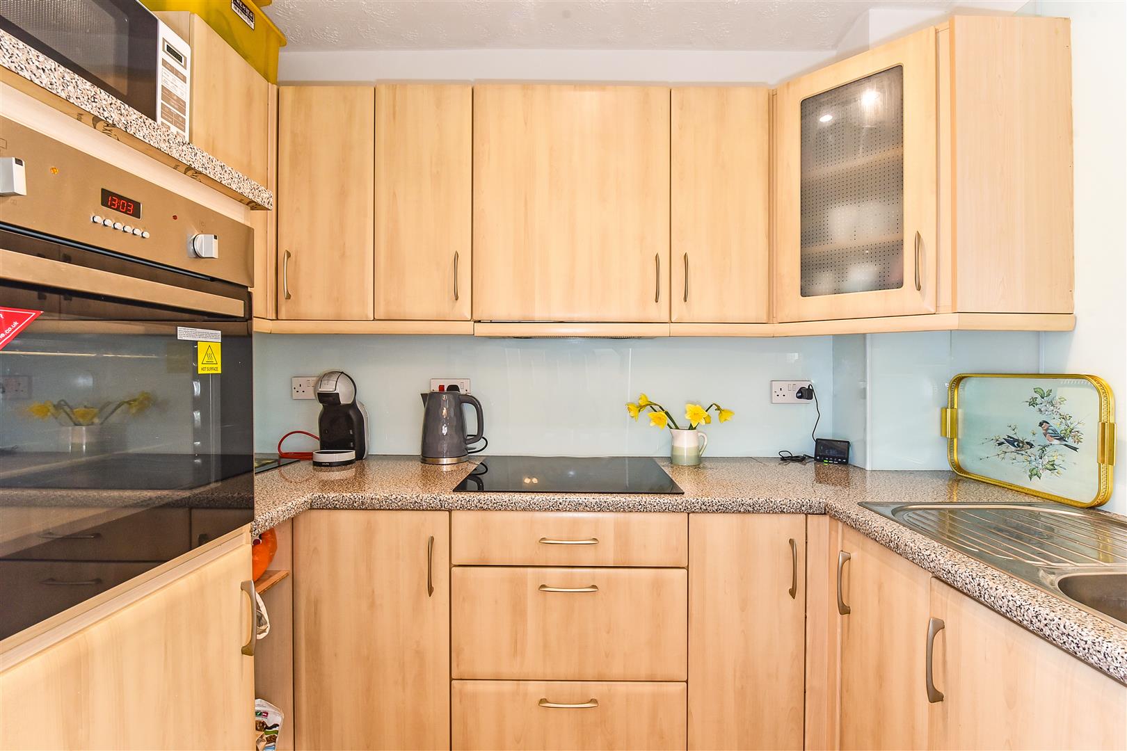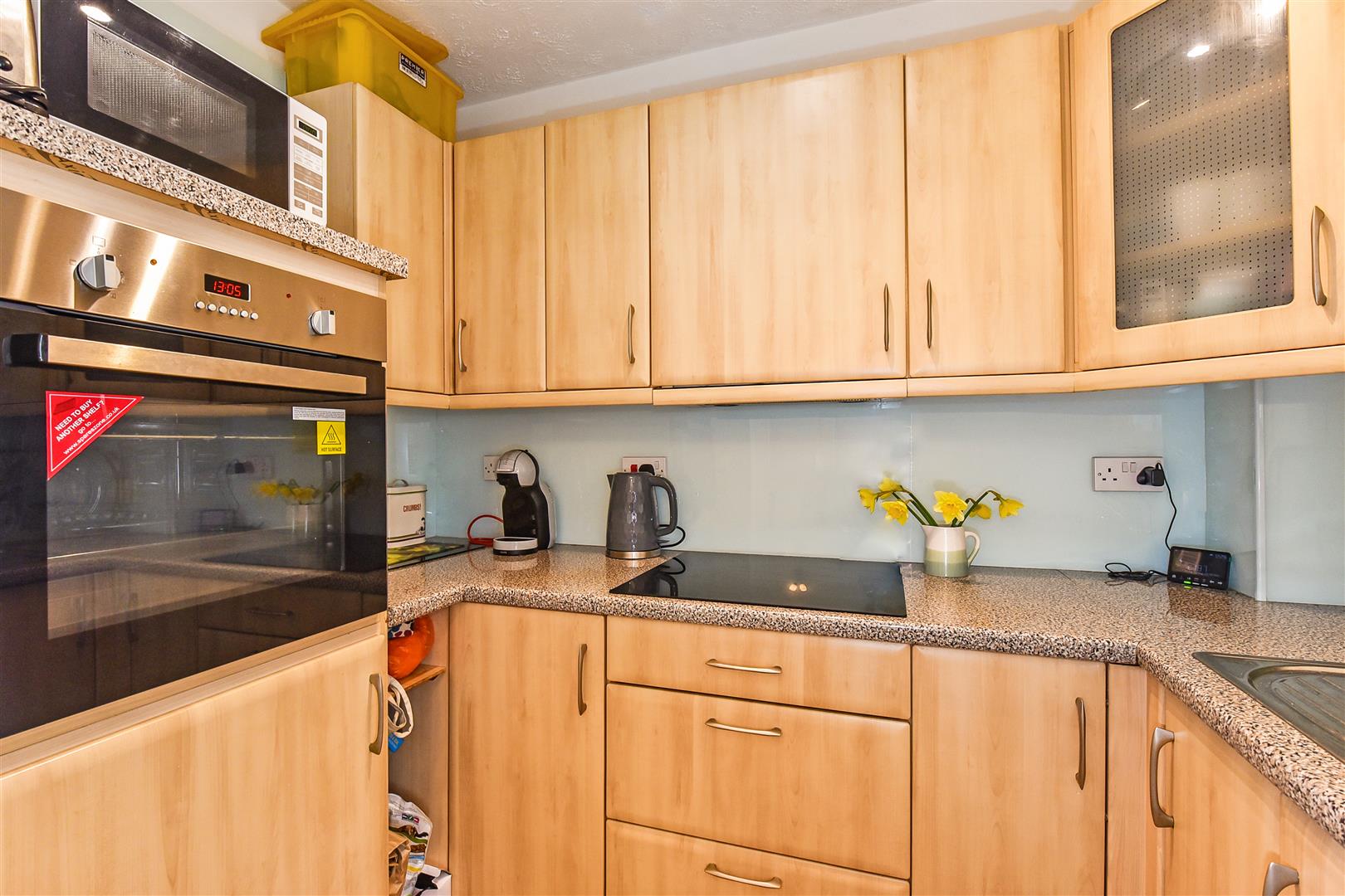 Kitchen - Comprising a range of modern style wall and floor mounted cupboards with fitted worktops, including an inset sink with mixer tap, electric hob and eye level oven.