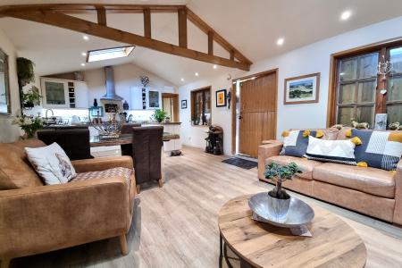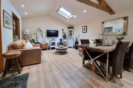 Lounge: Vaulted ceiling with wooden support beam, twin skylight windows, electric radiator, ceiling spotlights, two double glazed windows to side aspect, large wooden stable style door, matching flooring, glazed door leading to: