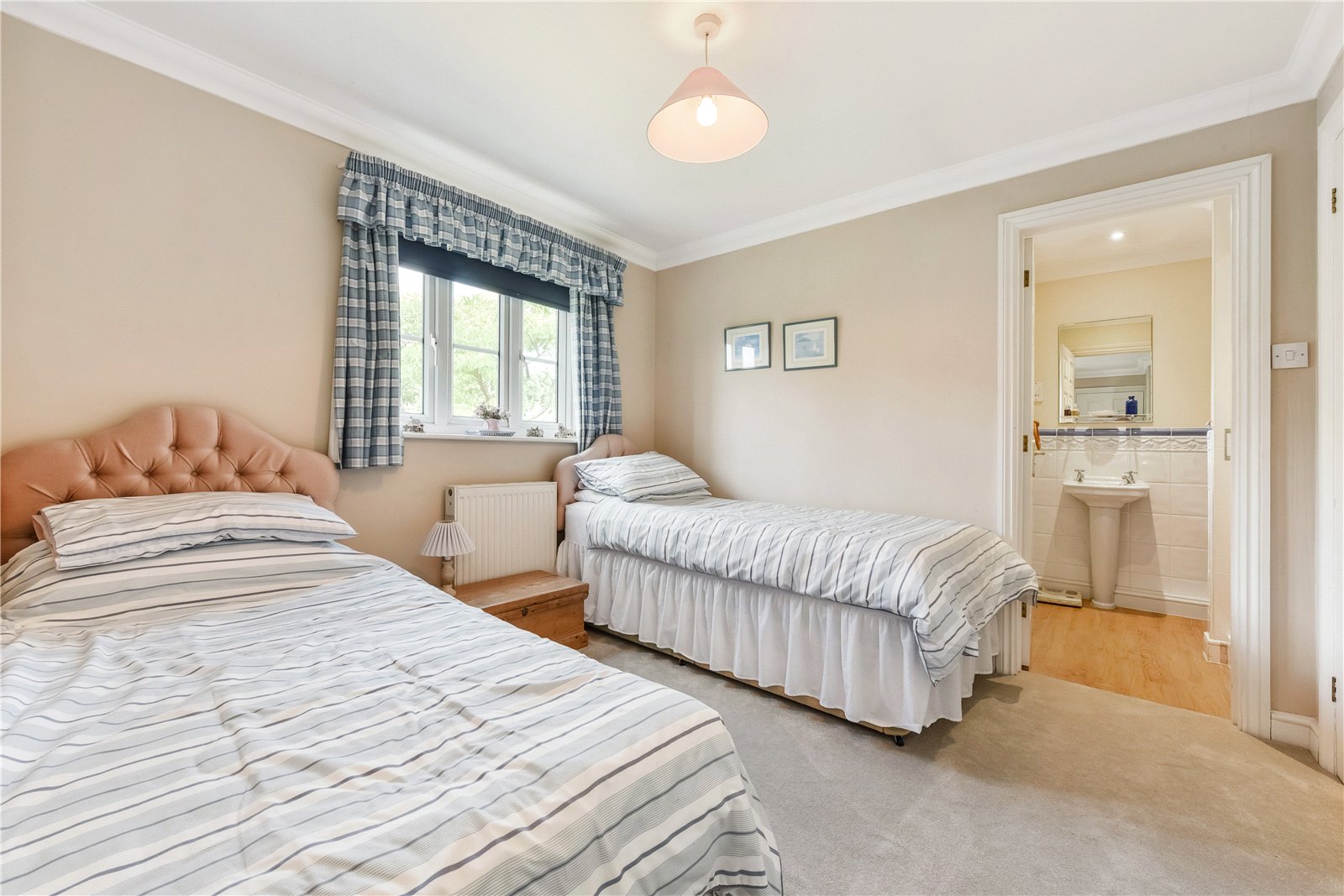 The first floor is arranged to provide excellent family accommodation. The principal bedroom suite is generously proportioned with ample built-in storage. There are three further bedrooms, two of which are en suite. The fourth bedroom is currently configured as a study. A family bathroom completes the first floor. All rooms are light-filled and spacious, offering comfort and flexibility for family members or visiting guests.