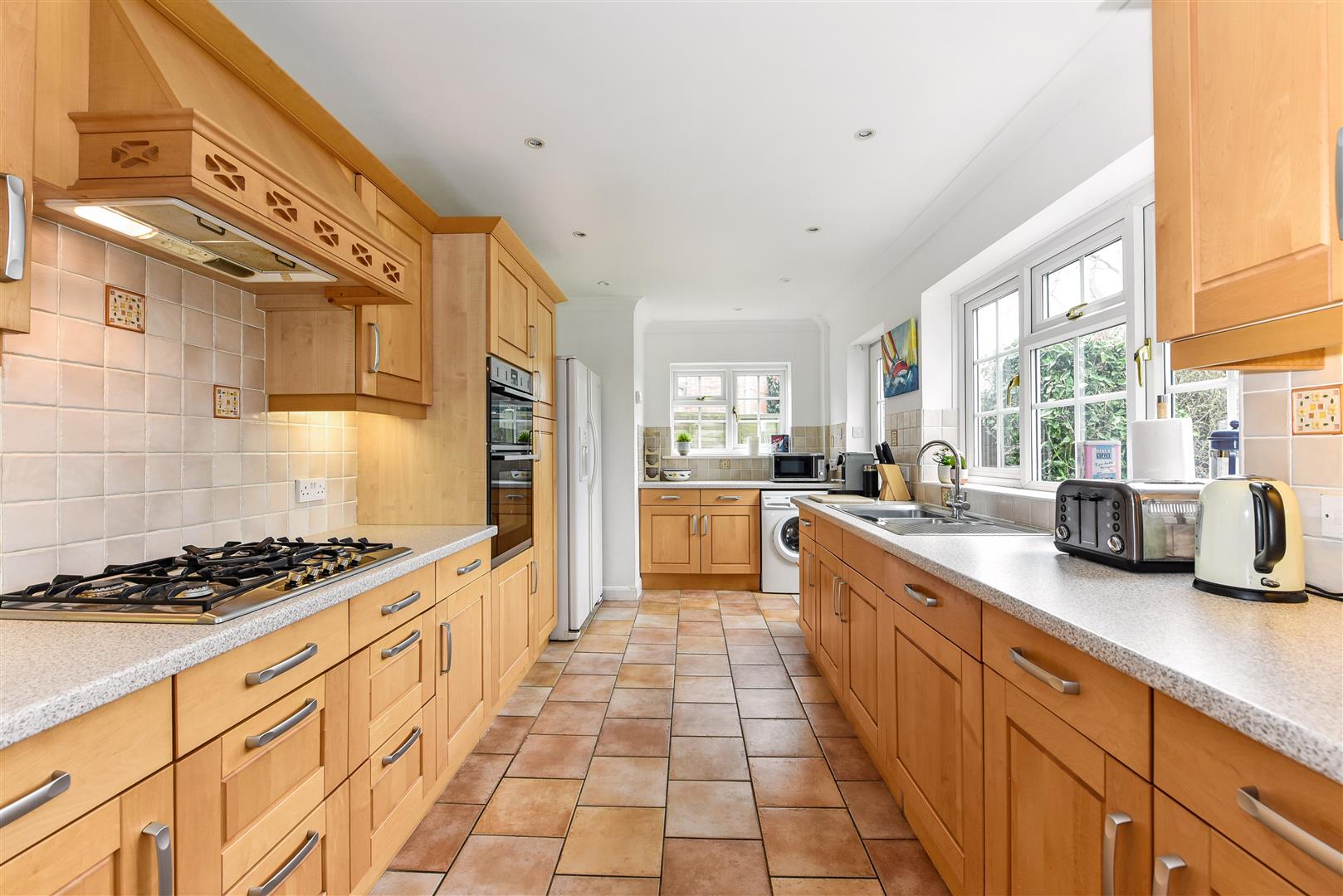 Kitchen/Dining Room: Tiled flooring, Neff 5-ring gas hob with overheard extractor fan, Neff wall mounted double electric ovens, American style fridge/freezer, Bosch dishwasher, Zanussi washing machine, stainless steel double sink and draining board, single door to rear garden, dining area with doors into conservatory.
