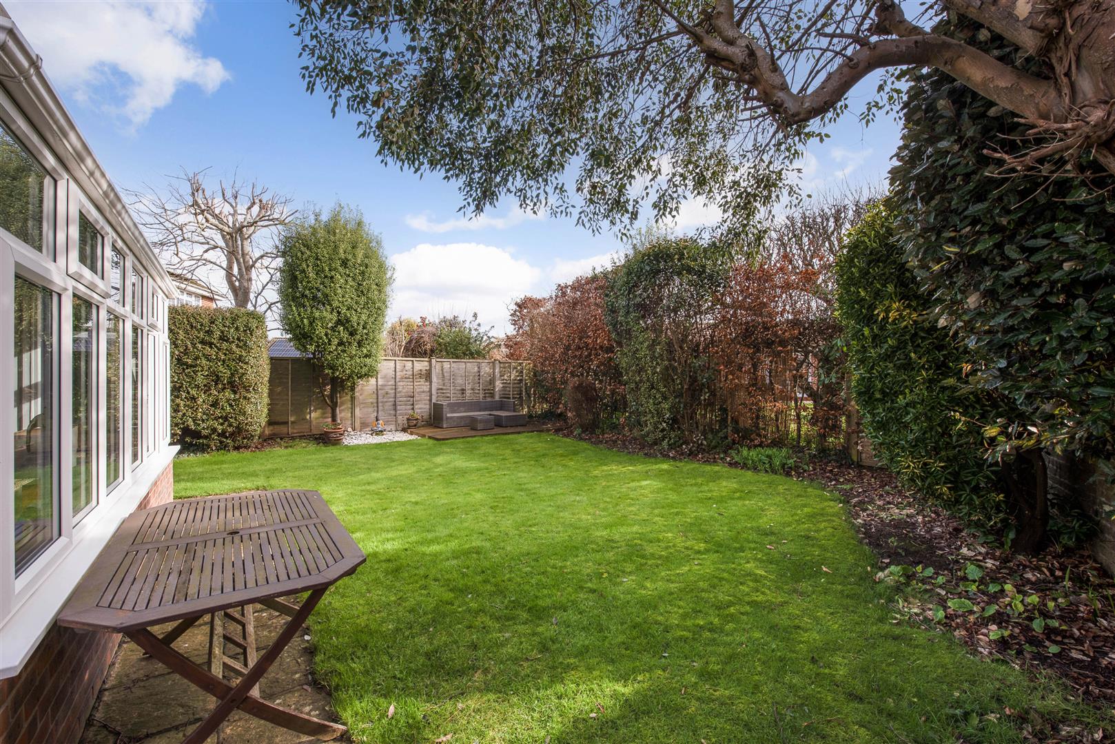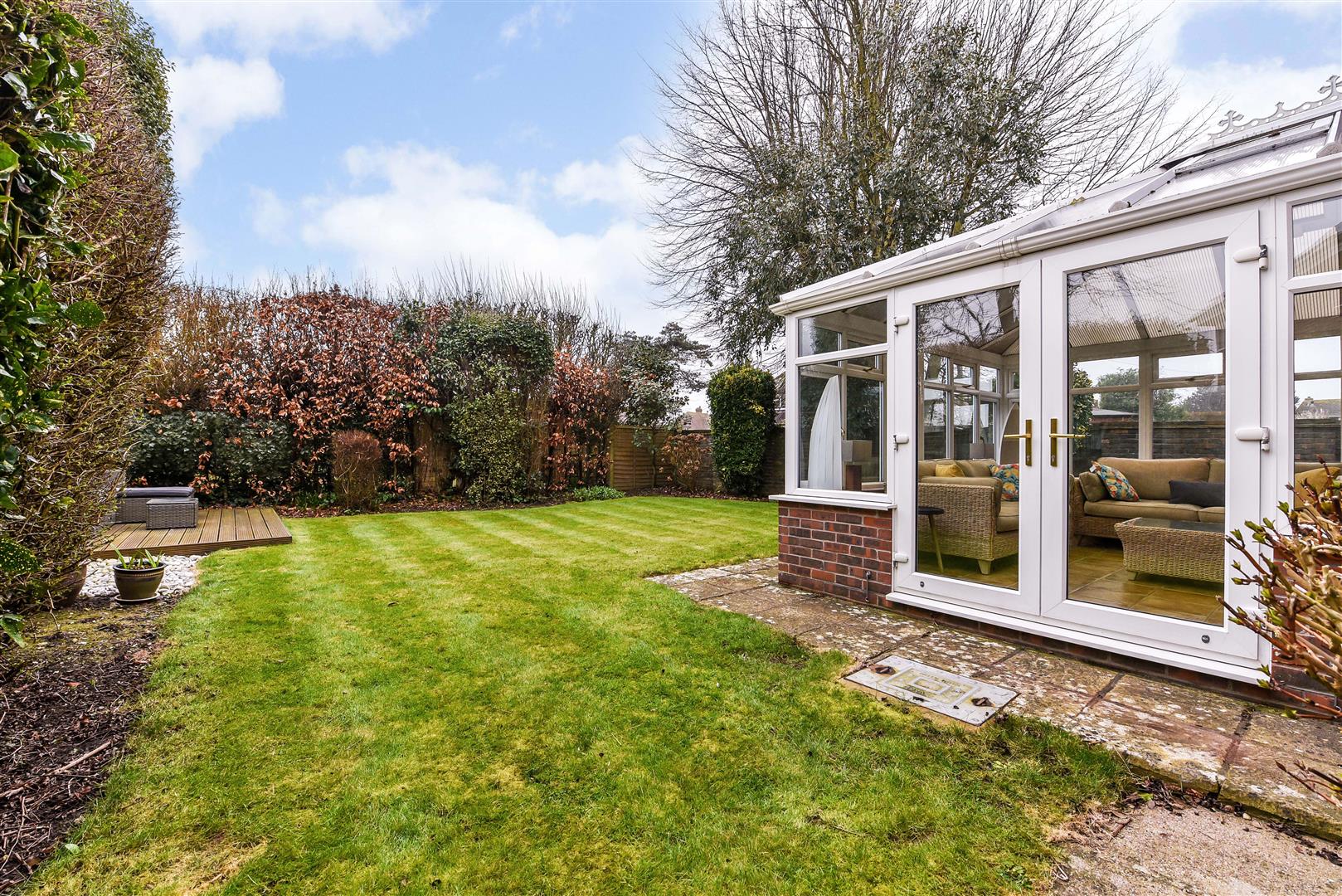 Rear garden: Southeast-facing rear garden which is predominantly lawned with hedge, tree, fence and wall borders, suntrap wooden decking area with garden furniture.