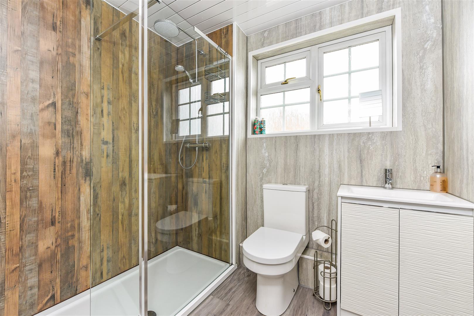 Ensuite Shower Room: Modern panelled walling, walk-in shower cubicle with rainfall and handheld showers, glass shower screen, chrome heated towel rail, wash basin and storage, WC, laminate flooring.