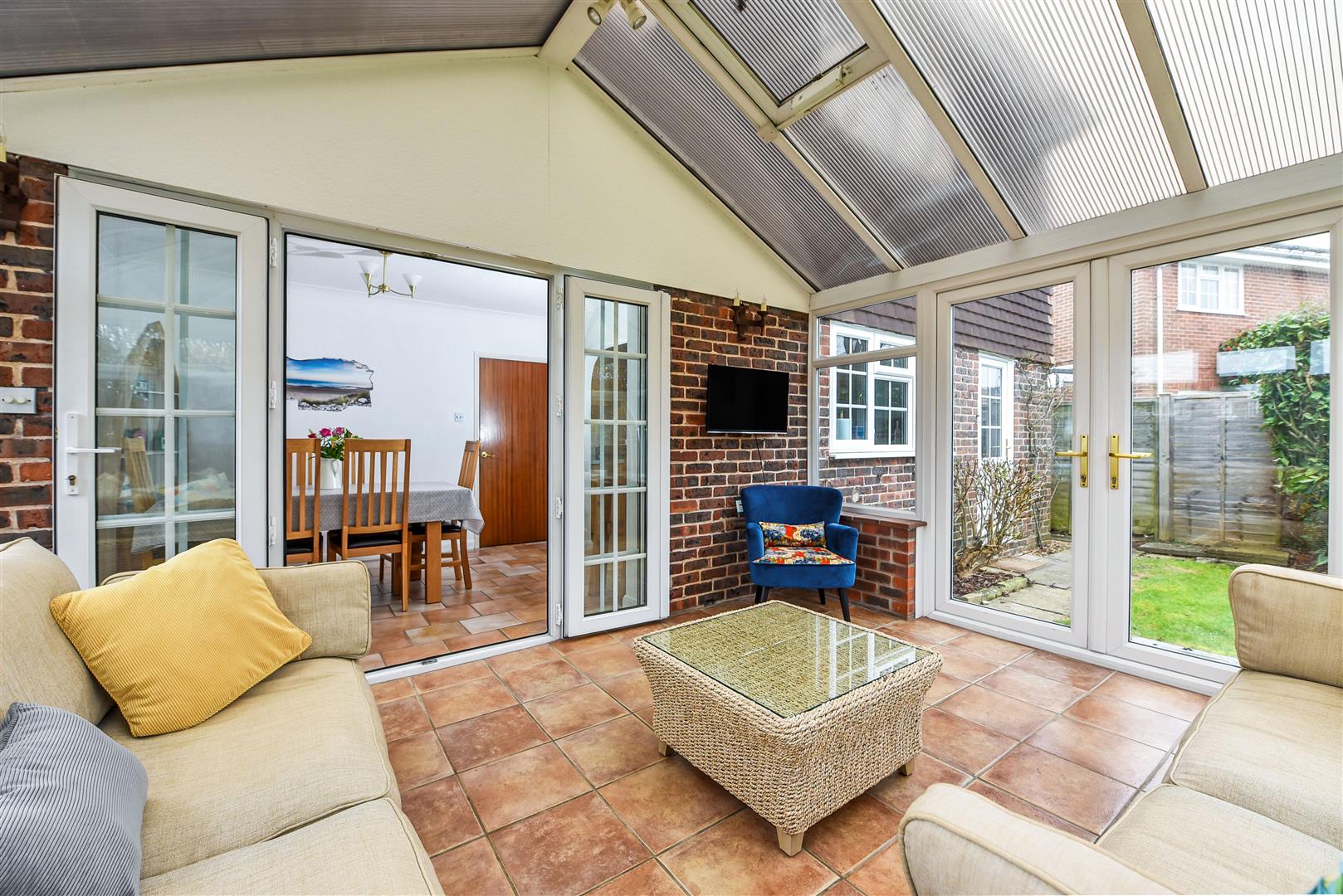 Conservatory: Brick base with upvc panels and opaque roof, French doors to rear garden, radiator.