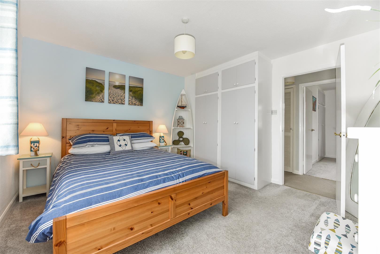 Bedroom 2: Three built in double wardrobe cupboards, two west-facing windows with curtain poles, radiator.