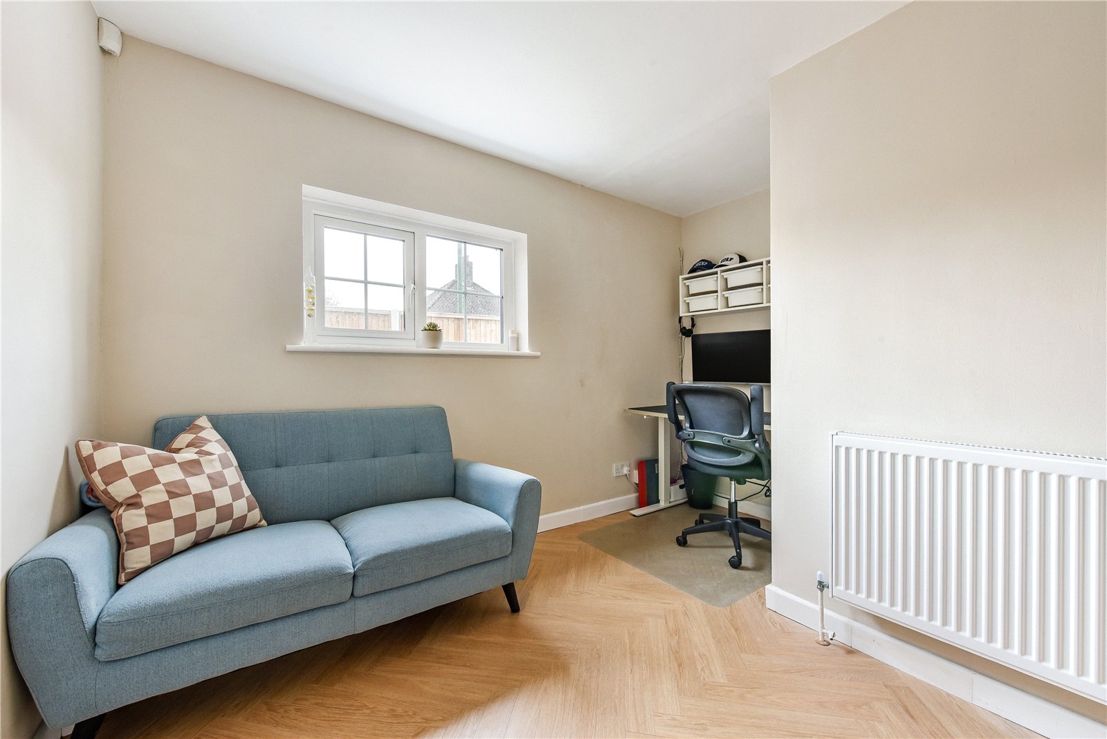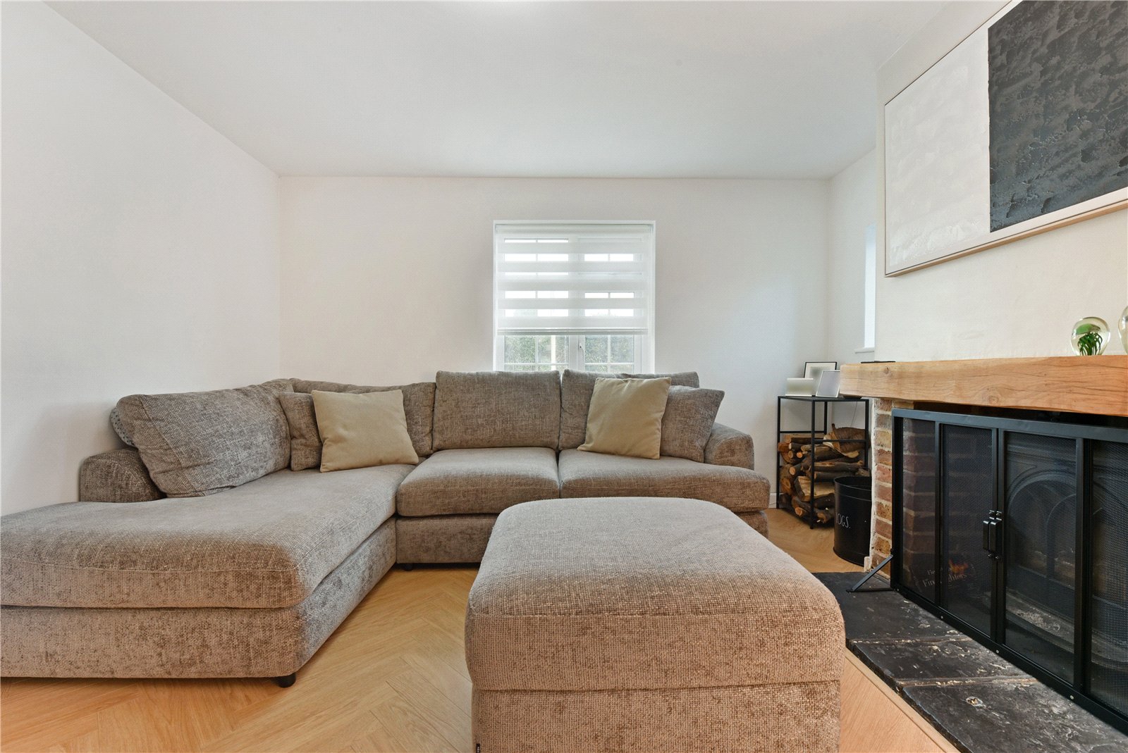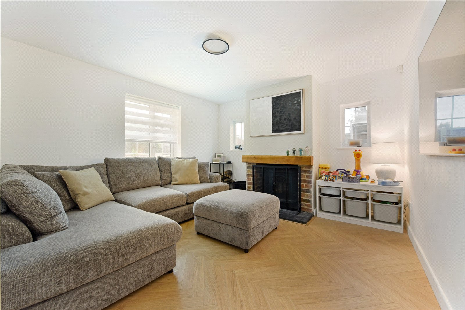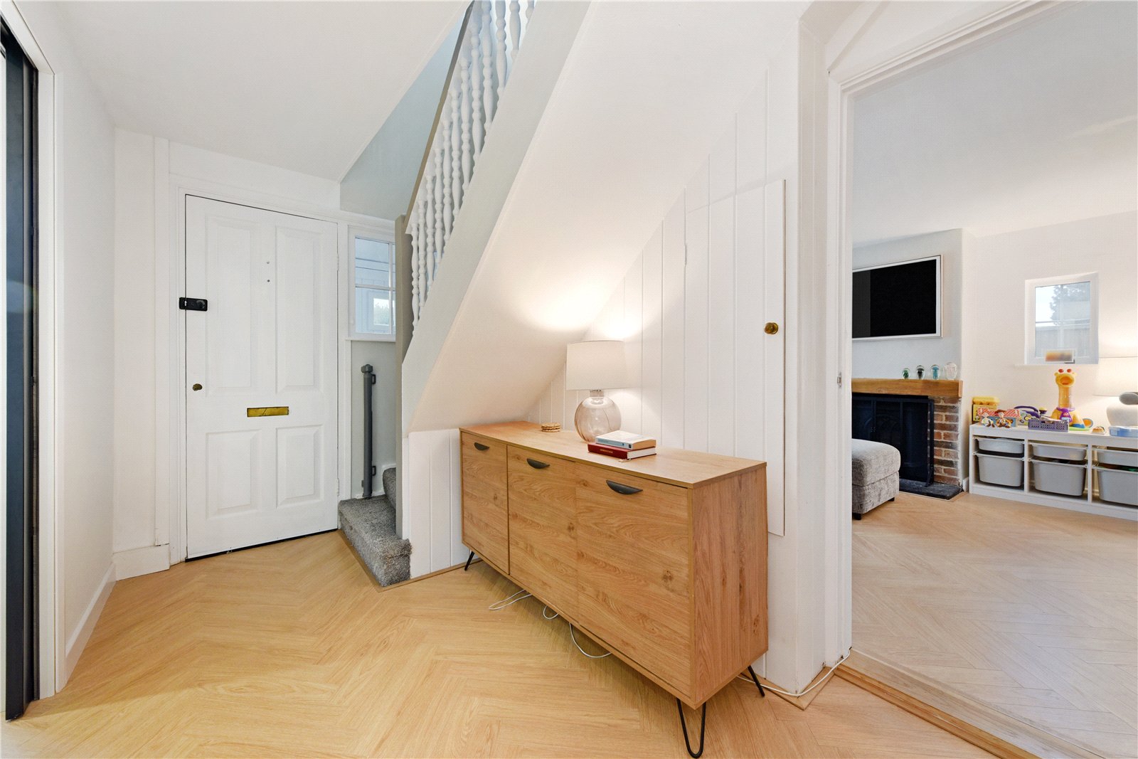 Approached via a pathway and wooden gate, an entrance porch opens into a welcoming reception hall with herringbone flooring extending across the ground floor. An almost square, dual-aspect sitting room features a focal-point fireplace housing a log burner, and across the hallway—also enjoying a bright dual aspect—is a dining room. The spacious kitchen/breakfast room is comprehensively fitted in an appealing design, with built-in oven and hob, space for key appliances, and a breakfast peninsula. Off the kitchen is a useful utility space with a garden door. Toward the rear is a TV snug, which could serve as an office, playroom or a fourth bedroom, while a cloakroom completes the ground floor. Upstairs, off a spacious landing, are three double bedrooms, two enjoying a garden view, with the main bedroom equipped with a bank of built-in wardrobes. The bedrooms are served by a contemporary four-piece family bathroom.