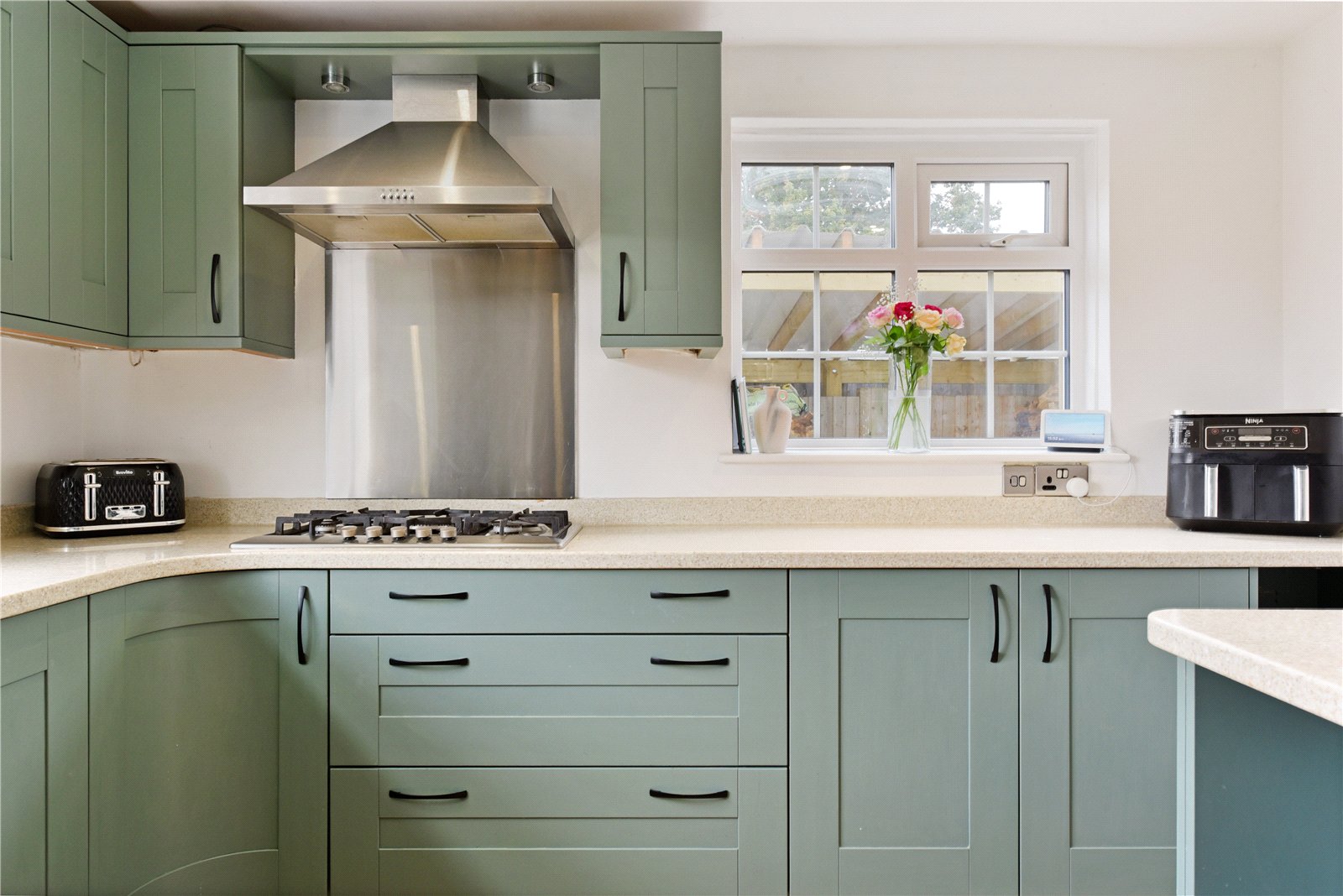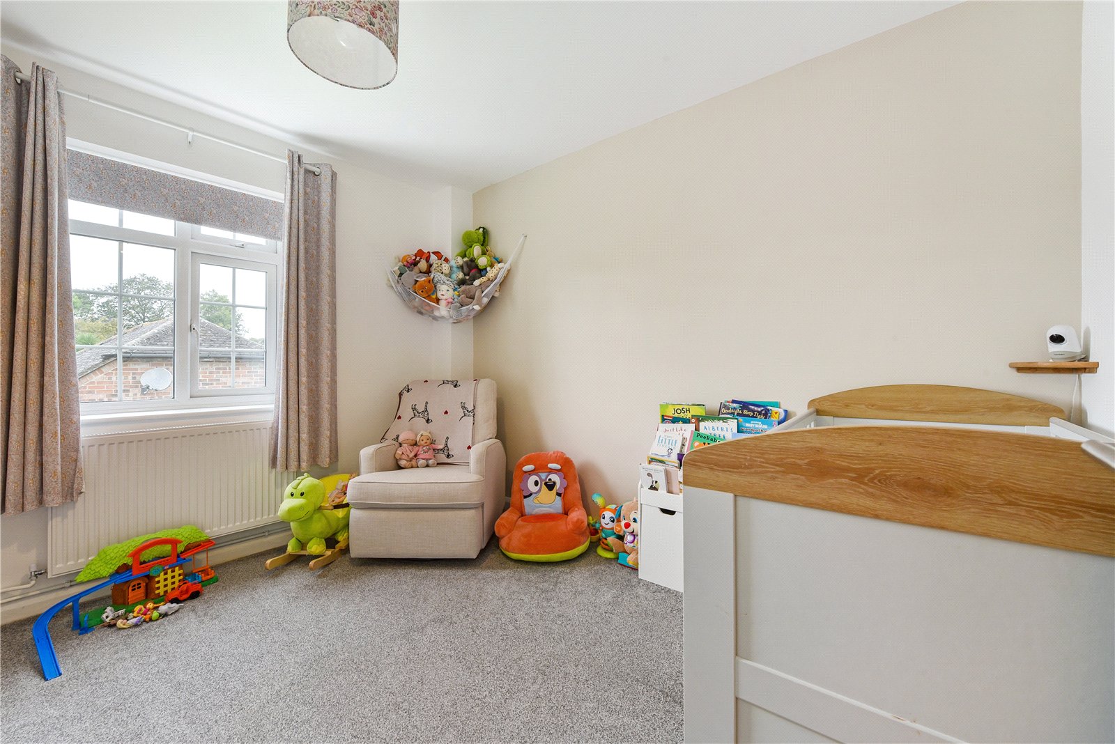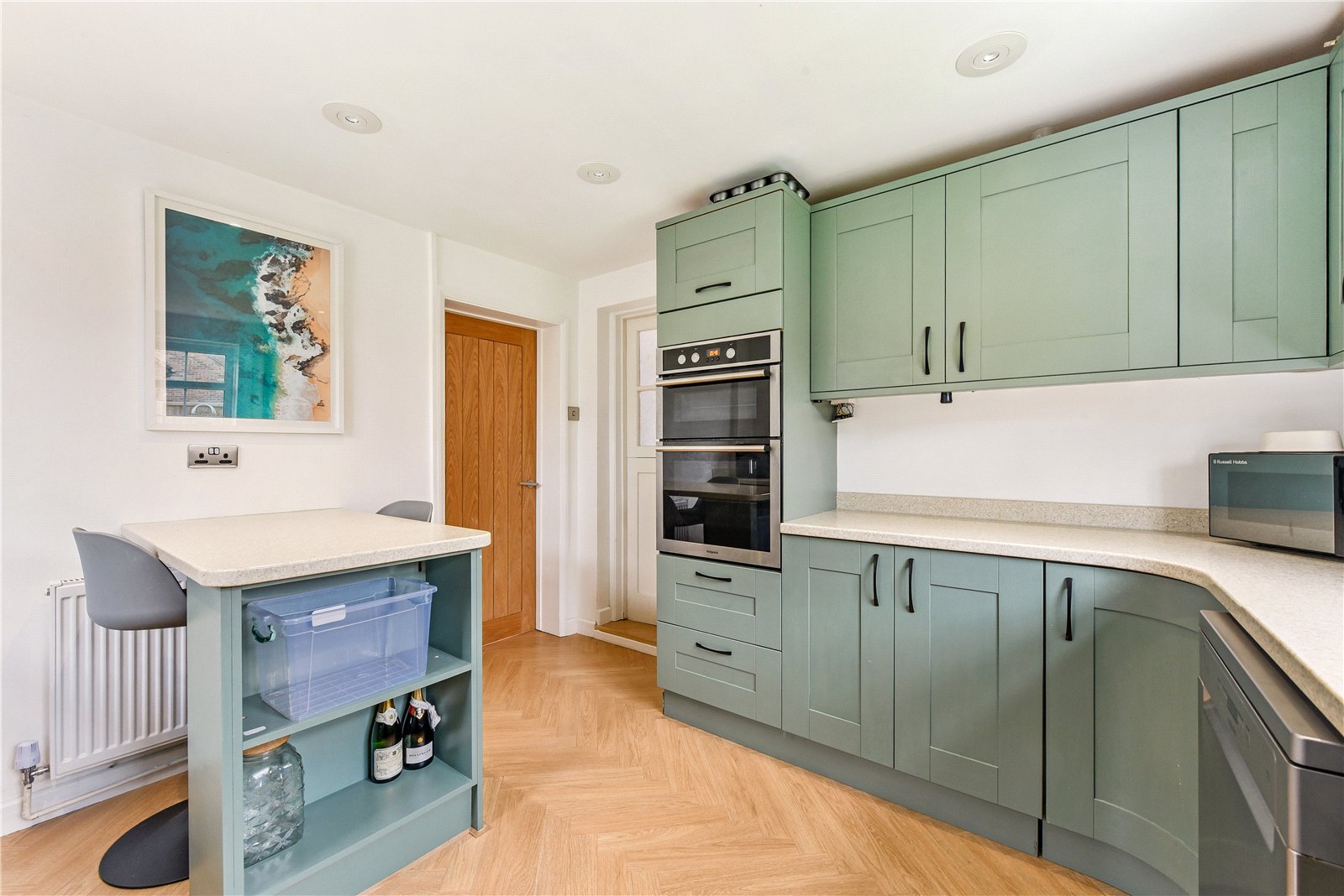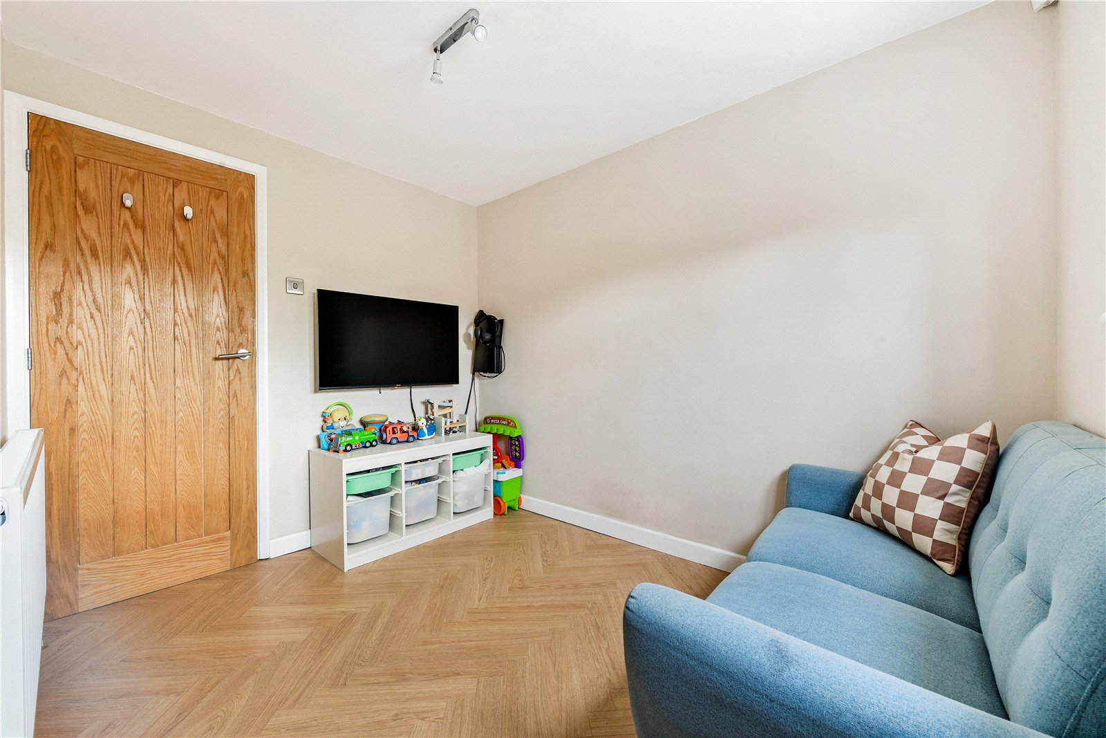 Approached via a pathway and wooden gate, an entrance porch opens into a welcoming reception hall with herringbone flooring extending across the ground floor. An almost square, dual-aspect sitting room features a focal-point fireplace housing a log burner, and across the hallway—also enjoying a bright dual aspect—is a dining room. The spacious kitchen/breakfast room is comprehensively fitted in an appealing design, with built-in oven and hob, space for key appliances, and a breakfast peninsula. Off the kitchen is a useful utility space with a garden door. Toward the rear is a TV snug, which could serve as an office, playroom or a fourth bedroom, while a cloakroom completes the ground floor. Upstairs, off a spacious landing, are three double bedrooms, two enjoying a garden view, with the main bedroom equipped with a bank of built-in wardrobes. The bedrooms are served by a contemporary four-piece family bathroom.