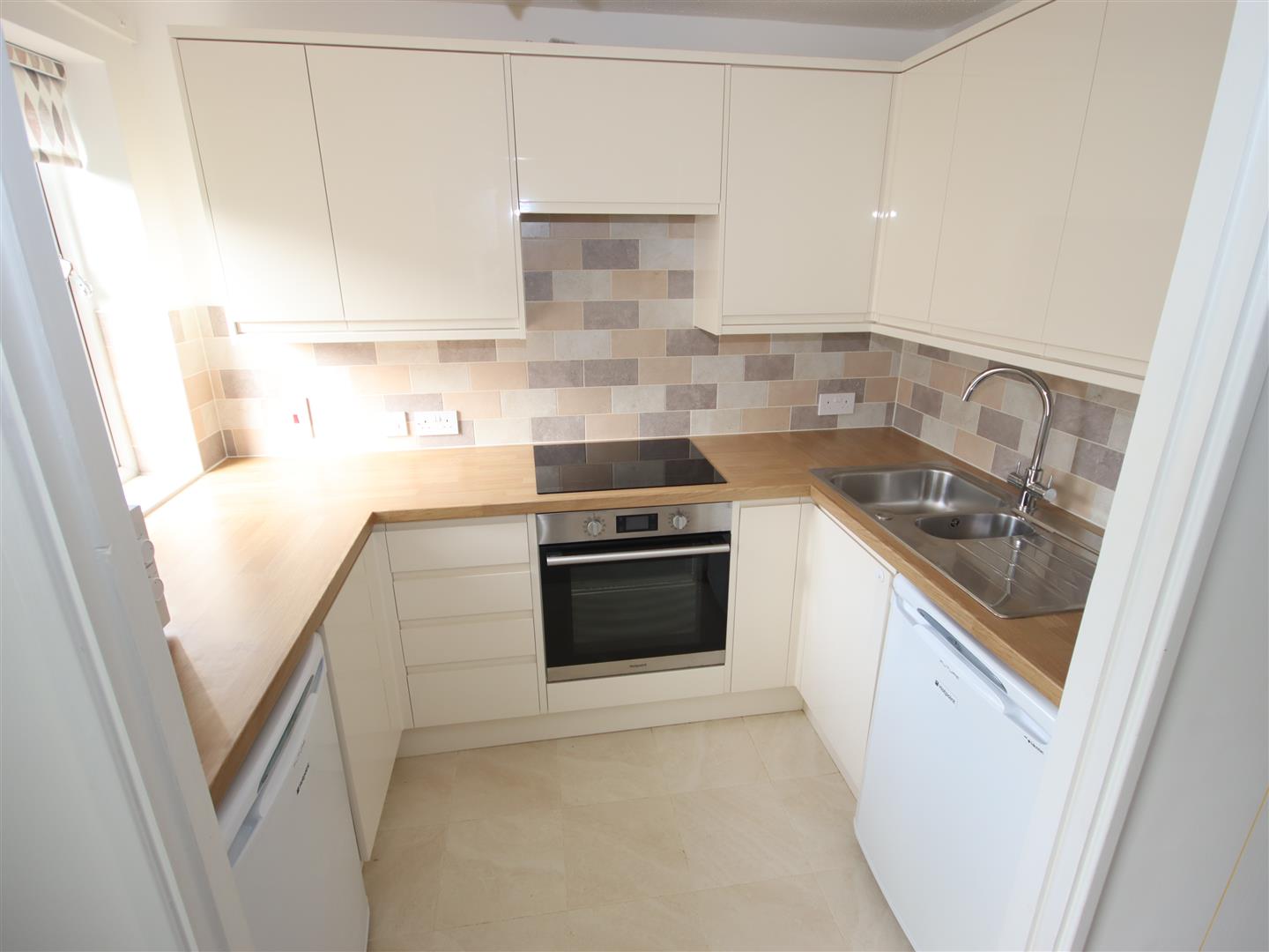 Refitted Kitchen - Double glazed window to front. Range of high gloss drawer and cupboard base units with matching wall mounted cupboards. Rolled edge worksurfaces with tiled splash backs and inset one and a half bowl stainless steel sink unit with chrome mixer tap. Built-in electric oven and induction hob with extractor over. Freestanding fridge and freezer. Tiled floor.