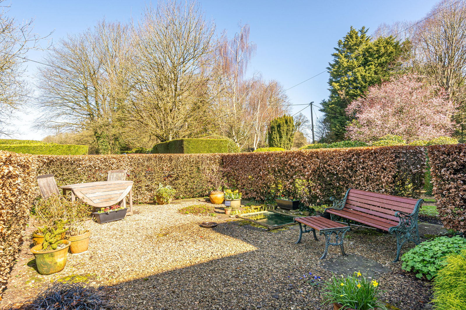 The wonderful gardens are beautifully maintained and thoughtfully landscaped into various distinct areas, screened by mature hedging. The gardens feature curved lawns, well-stocked perennial beds, and patio spaces. A private gravelled driveway provides convenient private parking for several vehicles.