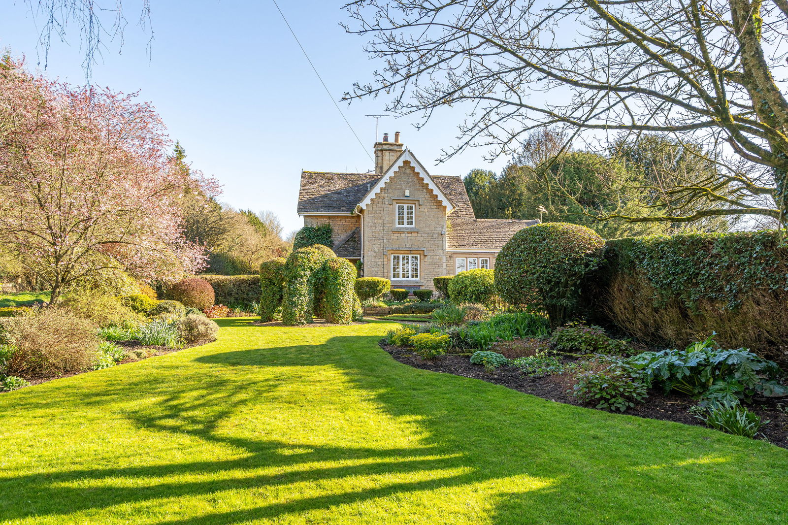 Constructed in natural stone as part of the historic Neeld Estate, the cottage exudes character with distinctive architectural touches including hood mould windows and ornately carved bargeboards. Inside, the property benefits from an abundance of natural light and excellent ceiling heights.