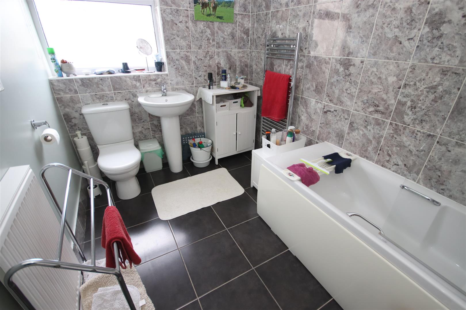 Family Bathroom - 9'9" x 6'7" - Obscure double glazed window to side. Refitted with white suite comprising panelled Carronite bath with Triton thermostatic power shower and glazed screen. Pedestal wash basin with chrome mixer tap. Close coupled WC. Chrome ladder style radiator . Tiled floor. Radiator. Recessed halogen spotlights. Fully tiled to three walls.