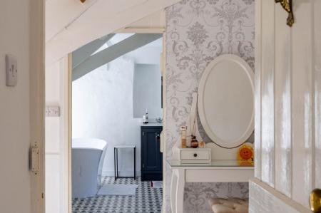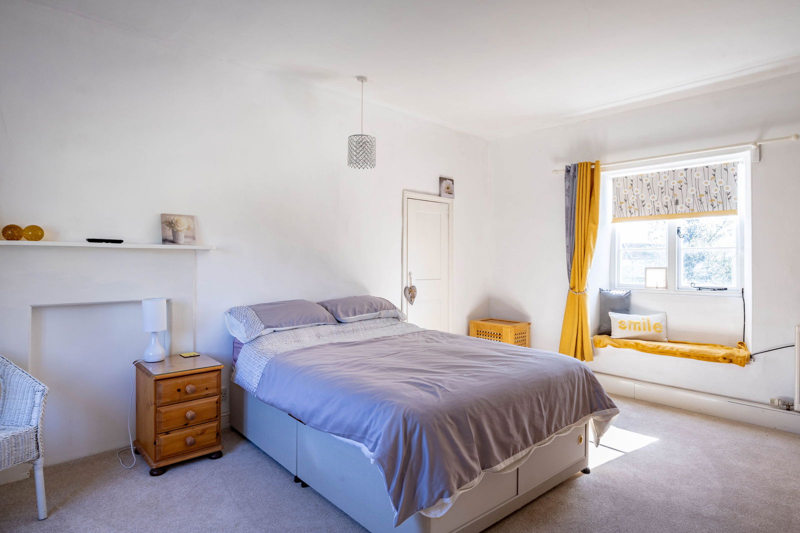 The upper floors host four comfortable bedrooms. The first floor accommodates two well-proportioned double bedrooms, including an impressive master bedroom featuring a built-in cupboard, a dedicated dressing room, and a stunning, spacious en-suite. Beautifully renovated by the current owners, the en-suite boasts a freestanding bath alongside a separate shower, creating a luxurious retreat. The dressing room further benefits from a separate staircase leading directly down to the kitchen, offering a unique and practical alternative access. The second bedroom, measuring 15'10" x 12'4", benefits from a built-in cupboard and dual-aspect windows to the front and rear, allowing for an abundance of natural light and enhancing the sense of space.