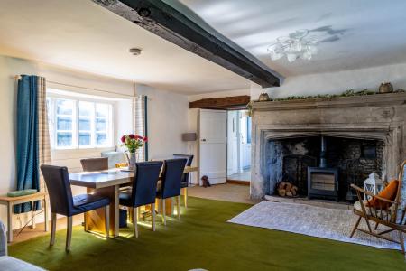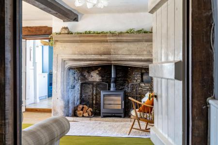 The Sitting Room, reached from the Reception Hall, offers a wonderfully cosy yet elegant retreat, centered around a striking stone fireplace with an inset wood-burning stove. Exposed wooden flooring and ceiling beams further enhance the room’s inviting ambiance. Opposite, the Dining/Family Room presents an equally impressive setting, showcasing a magnificent Tudor-arched stone fireplace with a wood-burning stove, creating a dramatic focal point and an undeniable sense of grandeur.