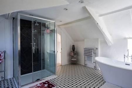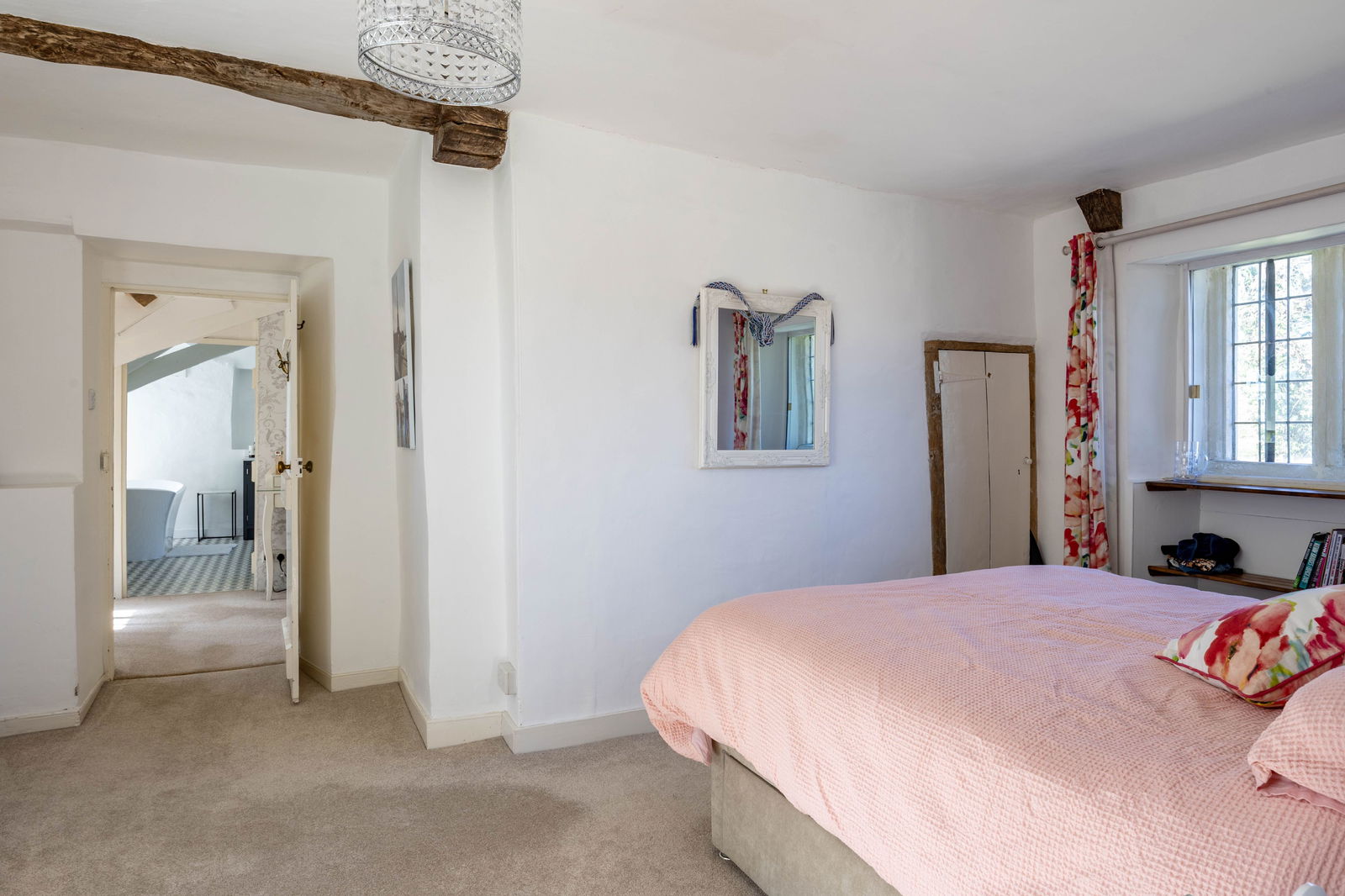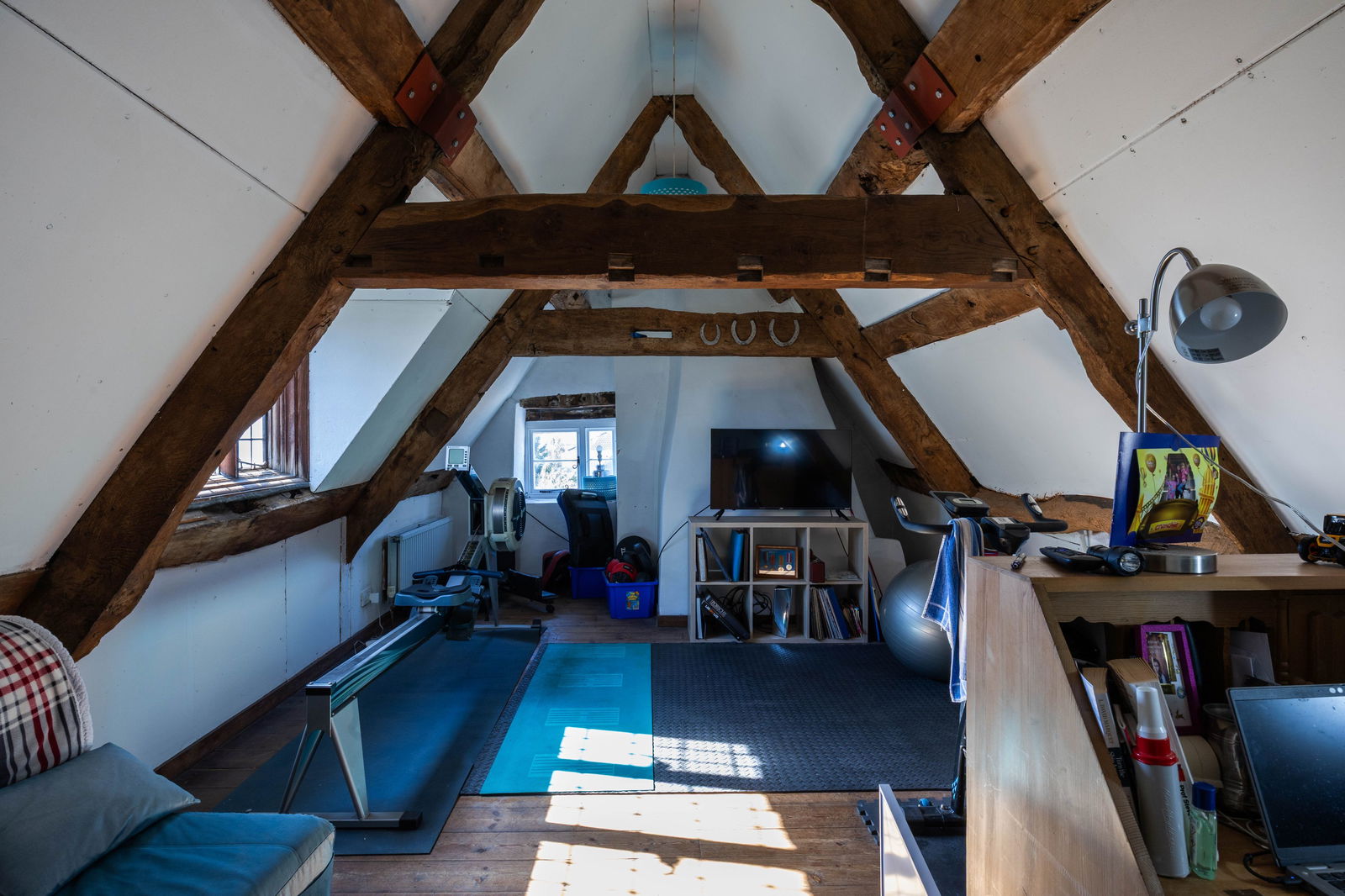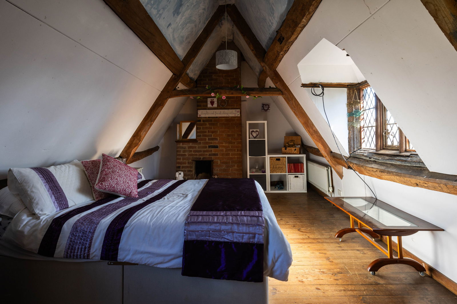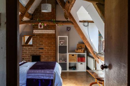 The main staircase leads to the top floor, where you’ll find two additional double bedrooms featuring vaulted ceilings and an abundance of exposed beams, creating a charming and characterful space. Each room benefits from a dormer window with a leafy outlook. This floor also offers excellent potential to add a further bathroom or en-suite, subject to planning permission.