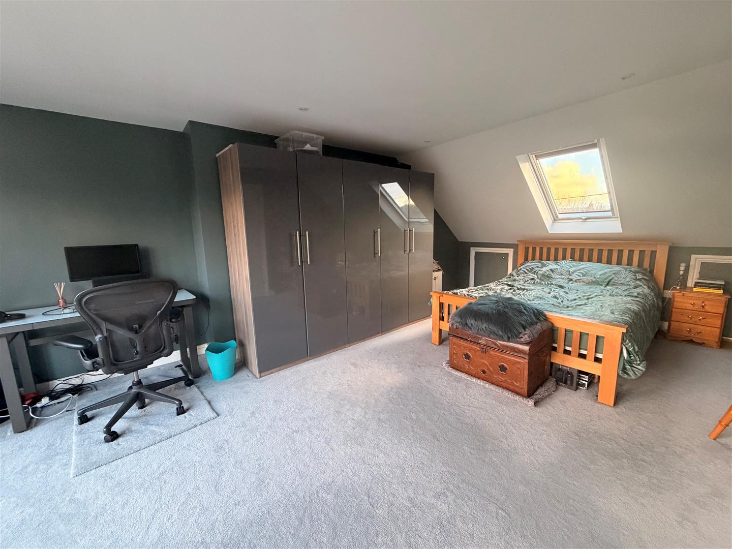 Bedroom One - uPVC French doors looking over rear garden with glass balustrade. Velux window in ceiling. Eve storage. Radiator.