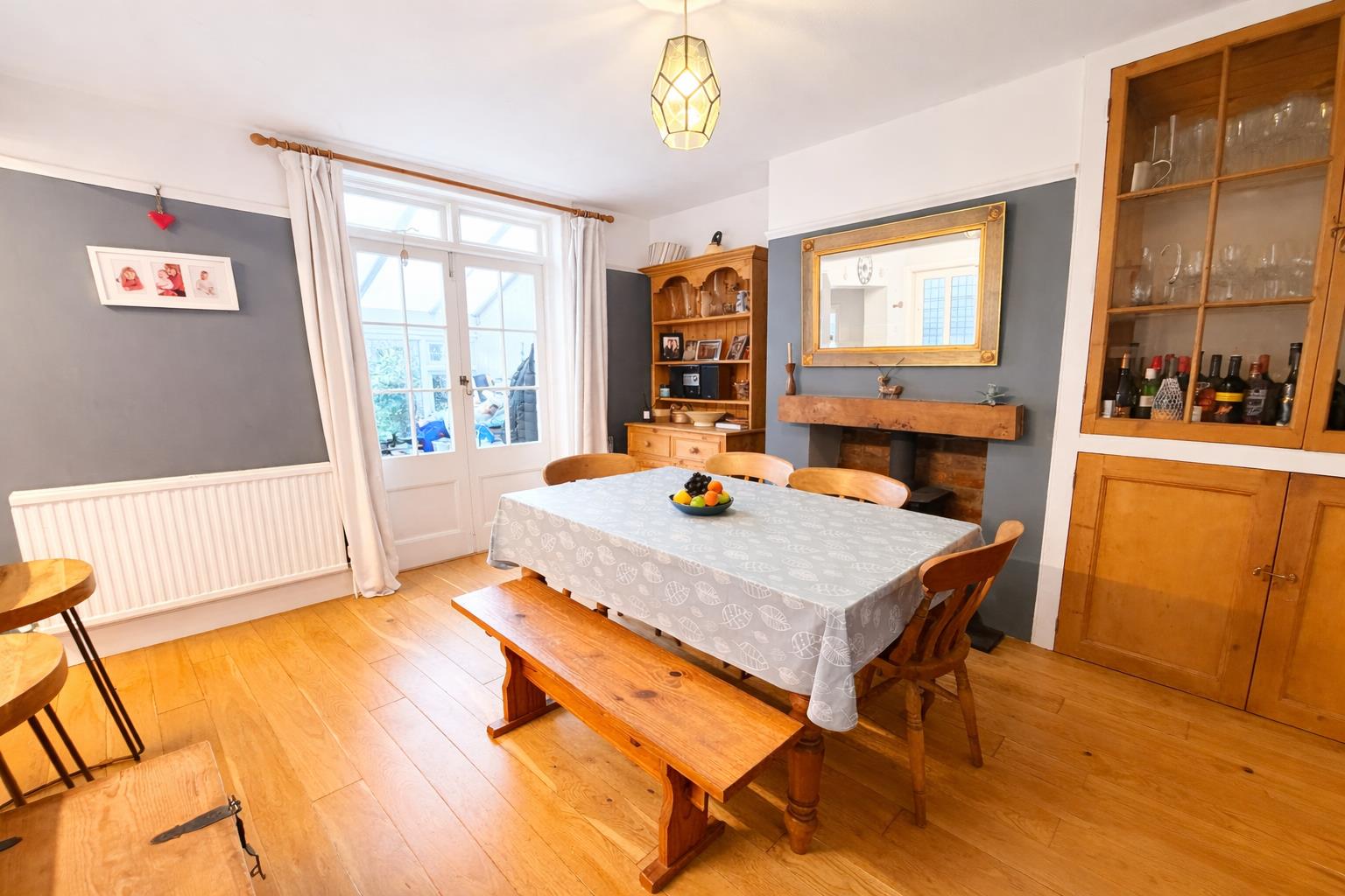 Kitchen/Dining Room - Double glazed windows and door to side. Range of drawer and cupboard base units with matching wall mounted cupboards. Rolled edge worksurfaces with tiled splash backs and inset one bowl stainless steel sink unit with chrome mixer tap. Integrated electric hob and oven. Space for washing machine and fridge/freezer. Fireplace housing wood burning stove in dining room with built in cupboard to side. Wood flooring. Picture Rail. Single glazed double door to: