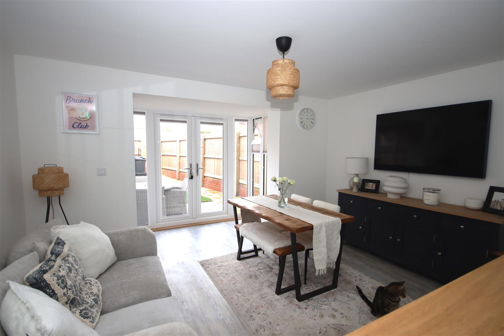 A beautifully presented end terrace property designed over three floors. A large glazed bay leading to the garden allowing light to stream into the open plan kitchen/family area on the ground floor, it also comprises of a study, cloakroom and utility area. The sitting room is on the first floor looking over the rear of the property, along with the family bathroom and one of the three double bedrooms, There are two further bedrooms on the second floor, one of these being the master with en suite. The garden is enclosed by fencing with gated side access. Patio area with lawn beyond. Two allocated parking spaces. The current owners have had this property from new and have opted for a number of optional upgrades to include shaker style kitchen, Amtico flooring, fitted wardrobes.