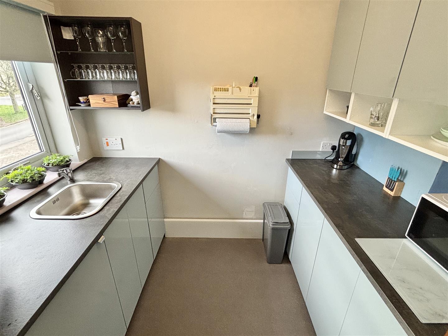 Refitted Kitchen - Double glazed window to front. High gloss drawer and cupboard base units with matching wall mounted cupboards. Work surfaces with inset stainless steel sink unit with chrome mixer tap. Integrated fridge.