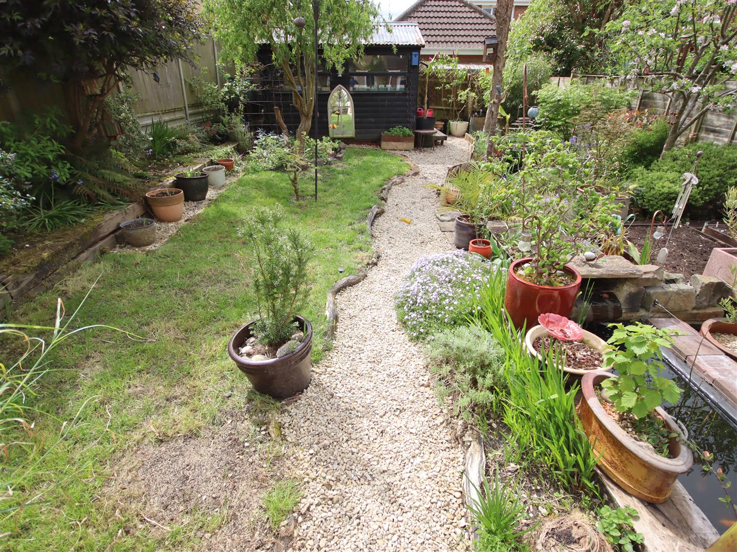 Rear Garden - A mature well stocked garden enjoying a easterly aspect. Fully enclosed by fencing. Two tier paved seating area with lawn beyond, mature trees and shrubs, pond and vegetable patch. Personal door to garage.
