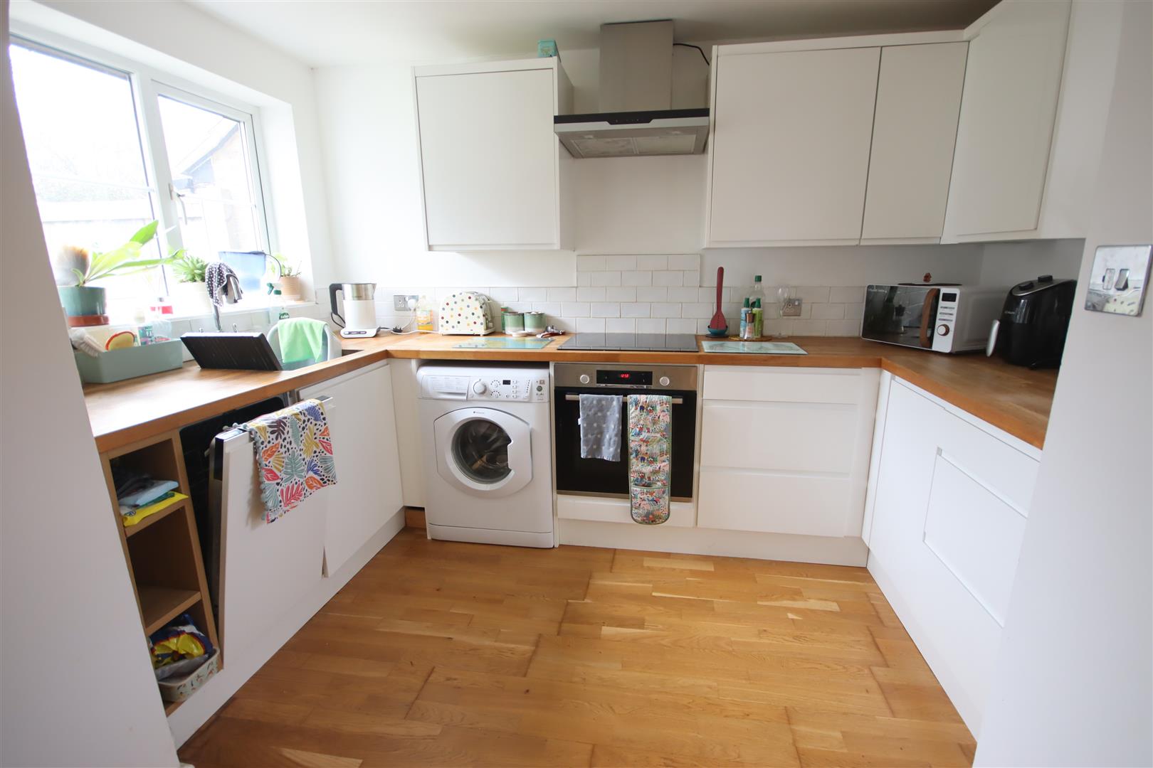 Kitchen - Double glazed window to front and rear. Fitted units comprising stainless steel single drainer sink unit with cupboard base unit under. Wooden worksurfaces with drawer and cupboard base units under. Wall mounted cupboards. Tiled splashbacks. Integrated dishwasher. Space for washing machine. Integrated electric hob and oven with stainless extractor over. Breakfast bar area with extra fitted cupboards and space for freestanding washing machine. Radiator. Double glazed door to rear garden.