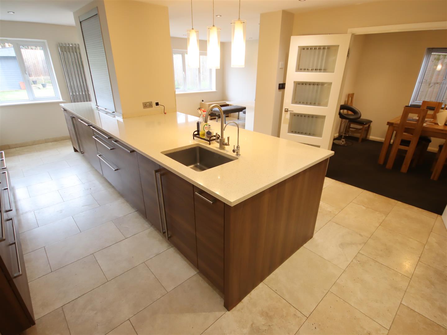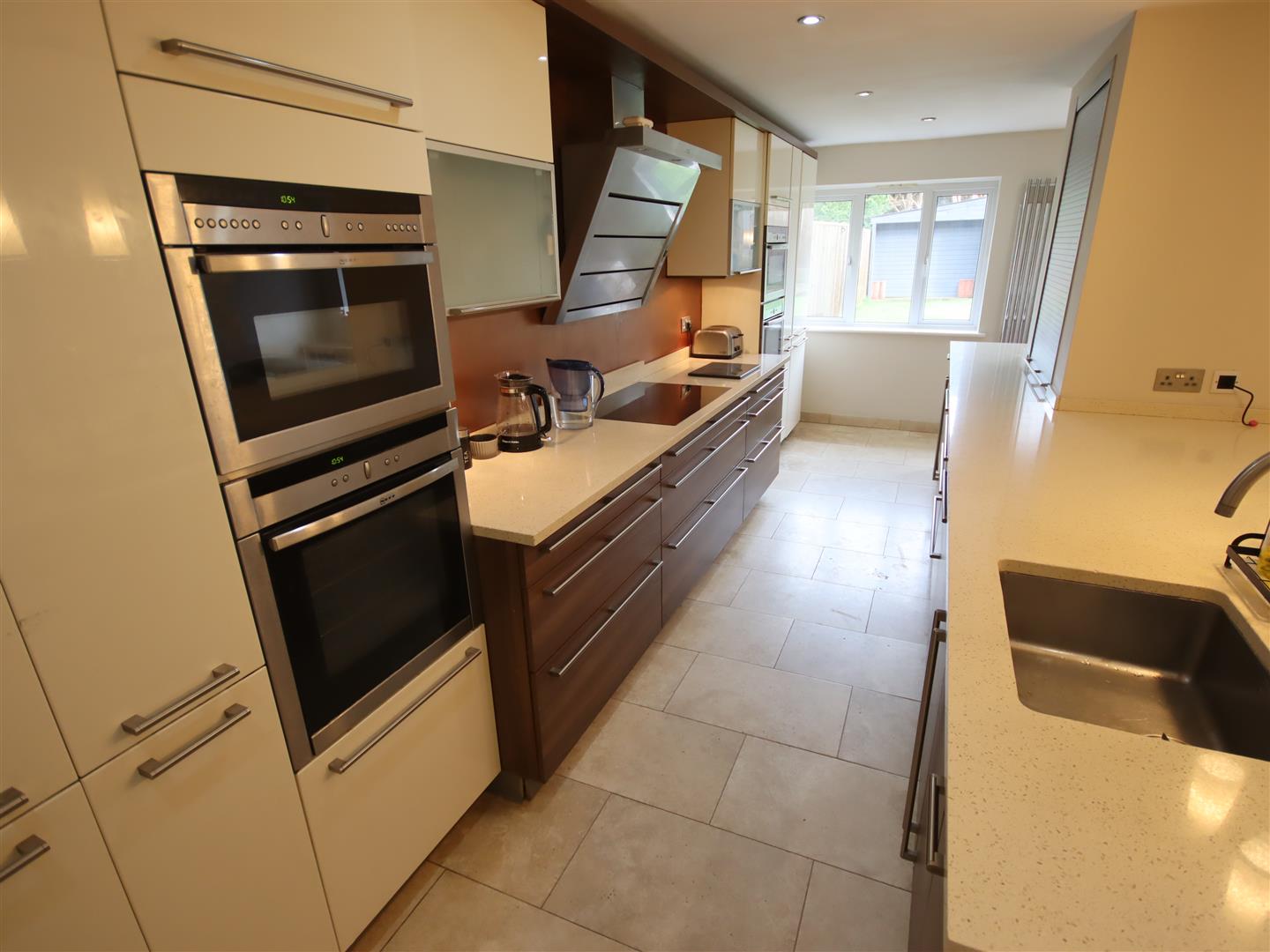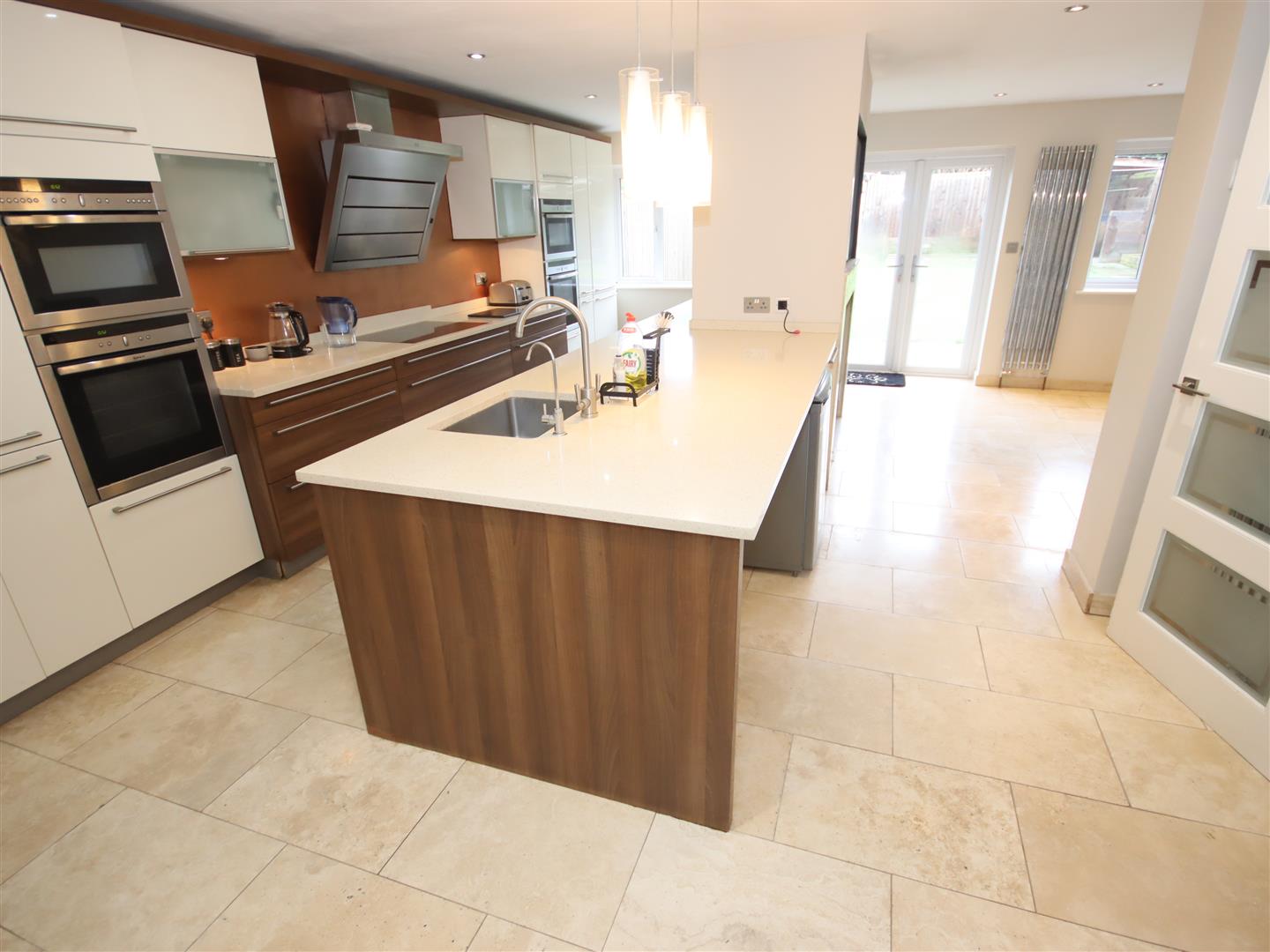 Kitchen/Family Room - An impressive and extended space, fitted with a German Pronorm Kitchen open to Family Room with a fireplace with inset wood burning stove. Two uPVC double glazed windows to rear. Double doors to Dining Room. The refitted Kitchen comprises of a range of contemporary wall, base and display units. Stainless steel sink and drainer inset to granite worksurfaces with upstands. Breakfast bar. Integrated Miele appliances to include full height fridge, freezer and dishwasher. Integrated Neff appliances combination microwave oven, two ovens, steamer and five ring electric induction hob with feature stainless steel cooker hood over. Three contemporary chrome radiators. Duel zone under floor heating. Tiled flooring. Understairs storage cupboard.